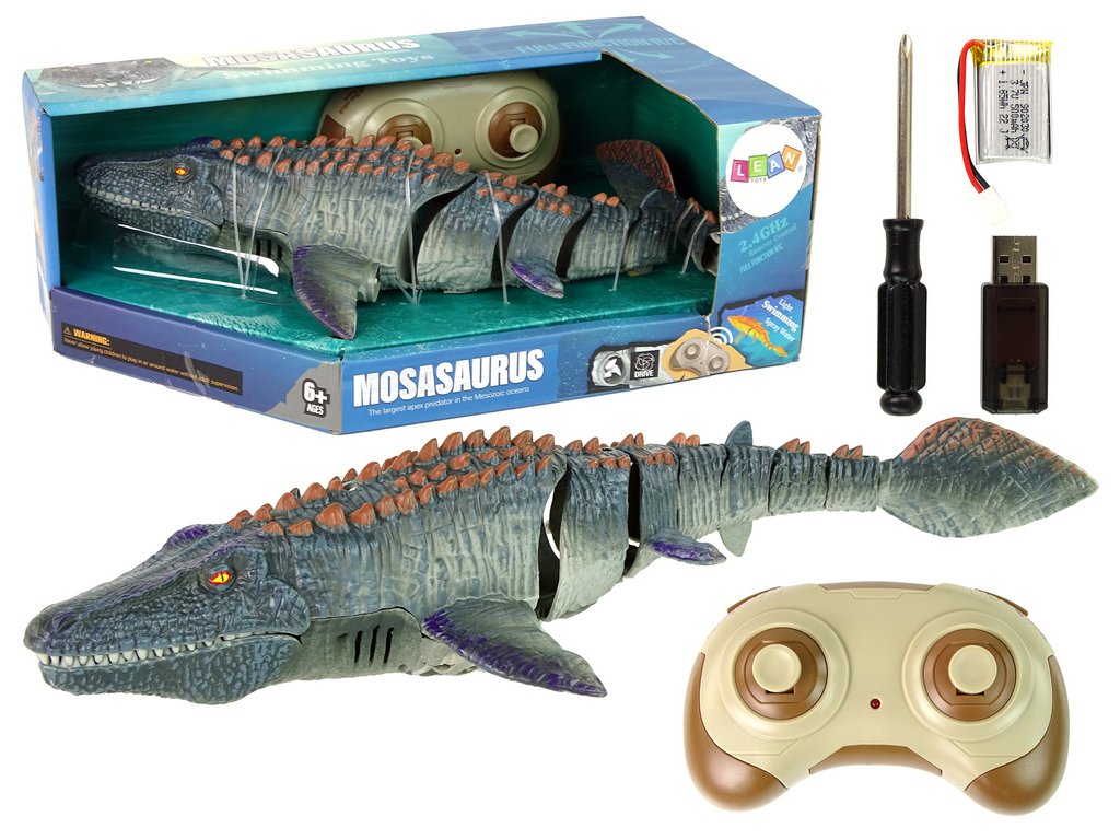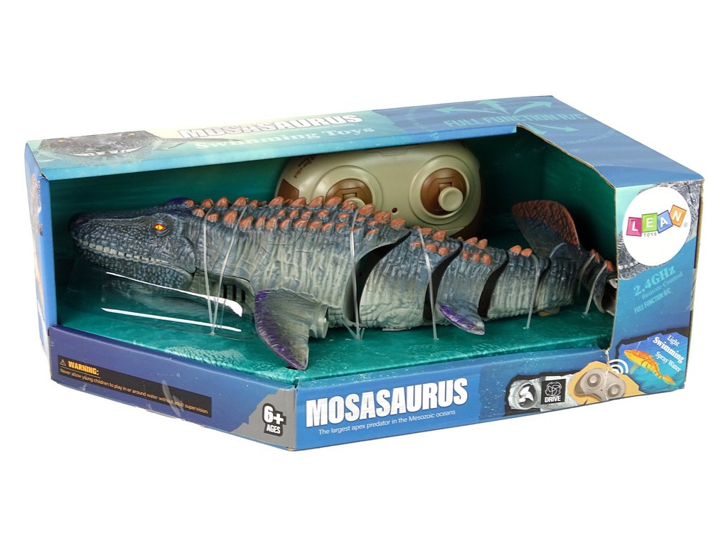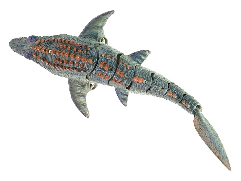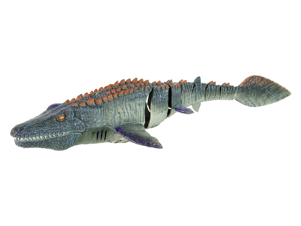 Mosasaurus má pohyblivý ocas, díky kterému může volně plavat pod vodou. Díky hnědému dálkovému ovladači (13 cm x 7 cm x 4 cm), který běží na 2 1,5V AA baterie (nejsou součástí), můžete ovládat jeho pohyby: nahoru, dolů, doprava, doleva, dozadu, dopředu. Dálkové ovládání má navíc 2 tlačítka pro aktivaci vodního rozprašovače, který je umístěn na zadní straně tohoto vodního ještěra.