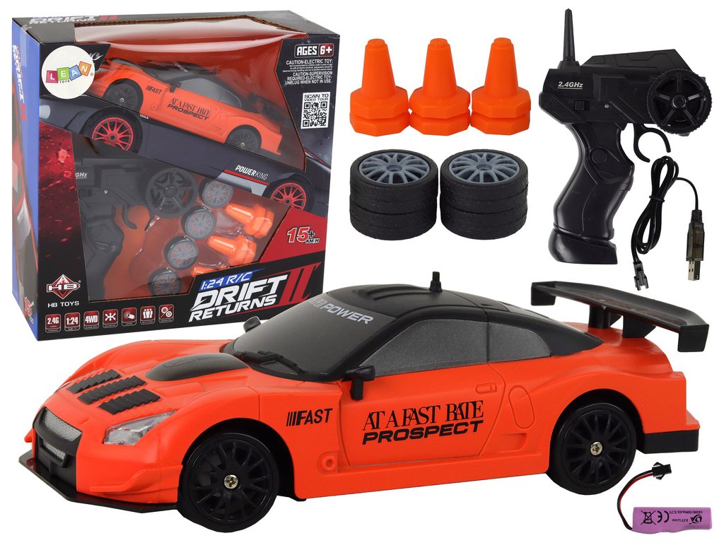 Oranžové auto není jen elegantní barevnou volbou, ale také kombinací stylového designu a působivého výkonu. Sada obsahuje 6 oranžových kuželů, které vám umožní upravit si trasu podle vlastních preferencí, a dvě sady kol – jedno s dezénem pro plnou stabilitu, druhé hladké, ideální pro velkolepé driftování.