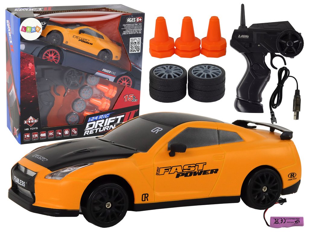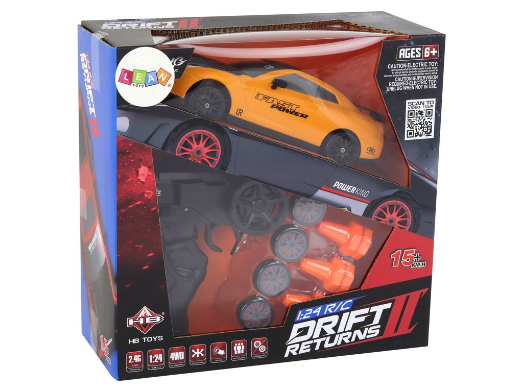 Žluté auto není jen elegantní volbou barvy, ale také kombinací stylového designu a působivého výkonu. Sada obsahuje 6 oranžových kuželů, které vám umožní upravit si trasu podle vlastních preferencí, a dvě sady kol – jedno s dezénem pro plnou stabilitu, druhé hladké, ideální pro velkolepé driftování.