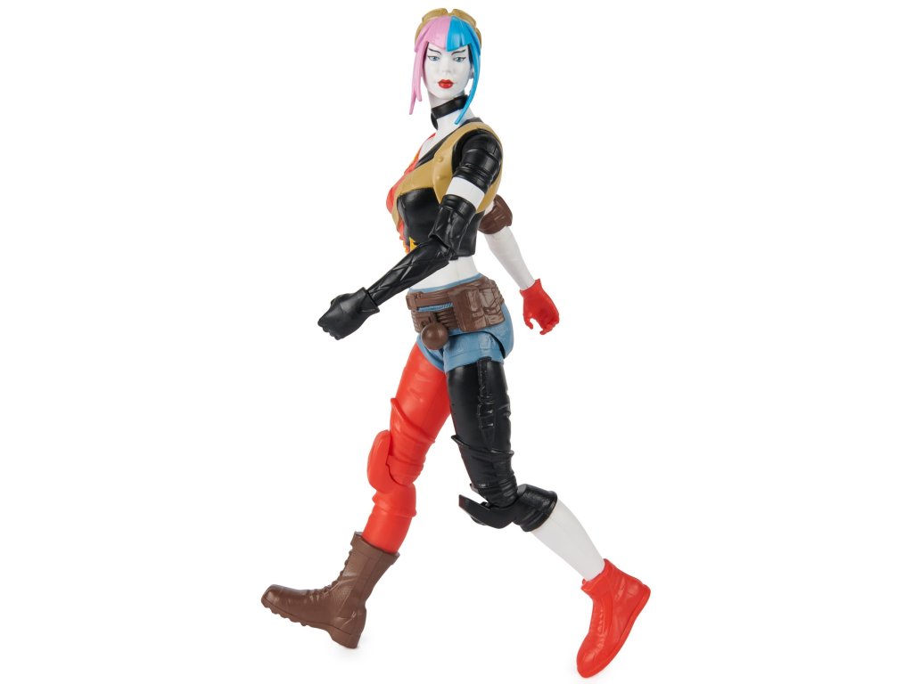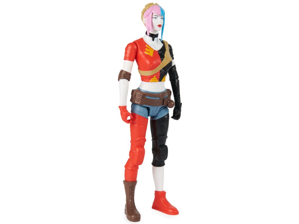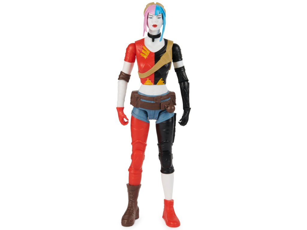 Figurka Harley Quinn jepřibližně 30 cm vysoká aje oblečena do krátkého černočerveného topu, černočervených kalhot a krátkých světle modrých šortek.