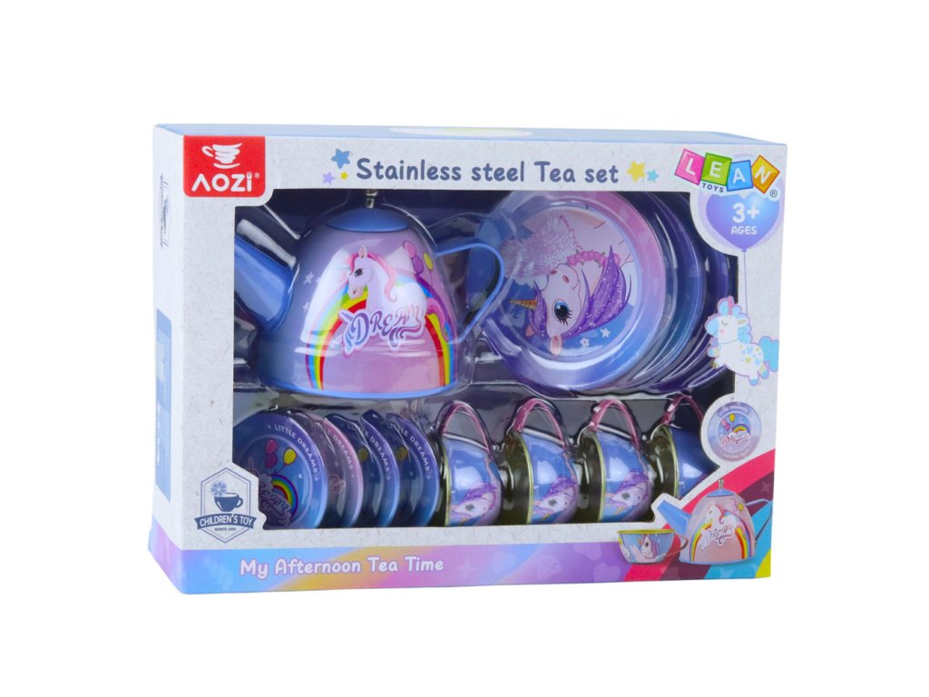 Tato kovová čajová souprava s motivem jednorožce je jedinečná hračka, která děti přenese do kouzelného světa fantazie a pohádkových čajových dýchánků. Sada je vyrobena z odolného kovu a nejen krásně vypadá, ale je také bezpečná a odolná proti poškození, což zajišťuje dlouhodobé používání.