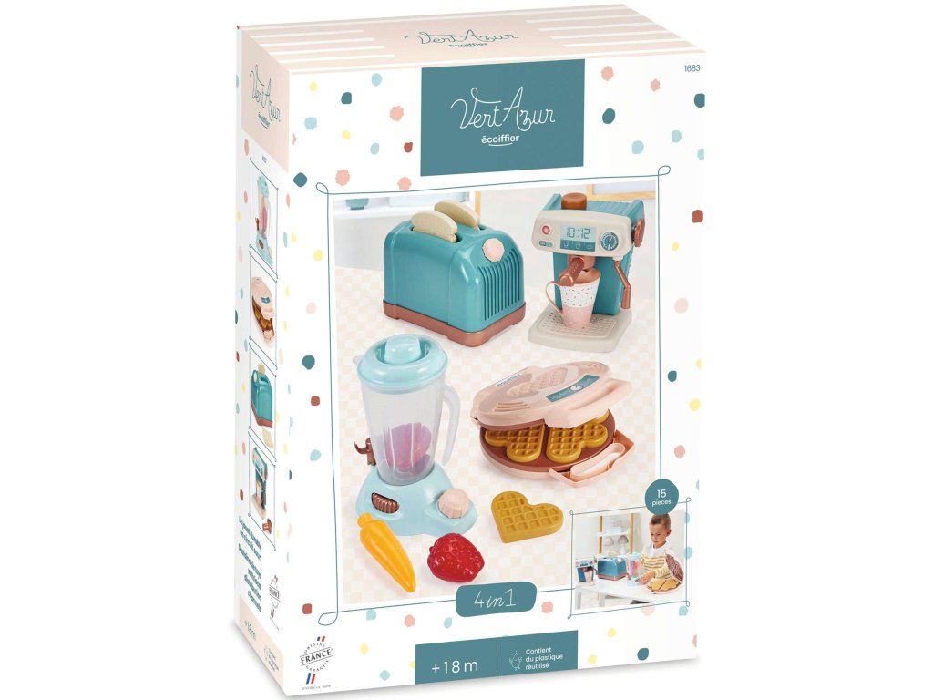 Sada kuchyňských doplňků Vert Azur obsahuje vše potřebné prokuchyňskou zábavu. Skládá se ztopinkovače s toustem,kávovaru,vaflovače s vaflemi,mixéruapříslušenství. Tato sada podněcuje dětskou představivost a napomáhá emocionálnímu a sociálnímu rozvoji v duchu Montessori, stejně jako rozvíjí logické myšlení, koordinaci ruka-oko a koncentraci.