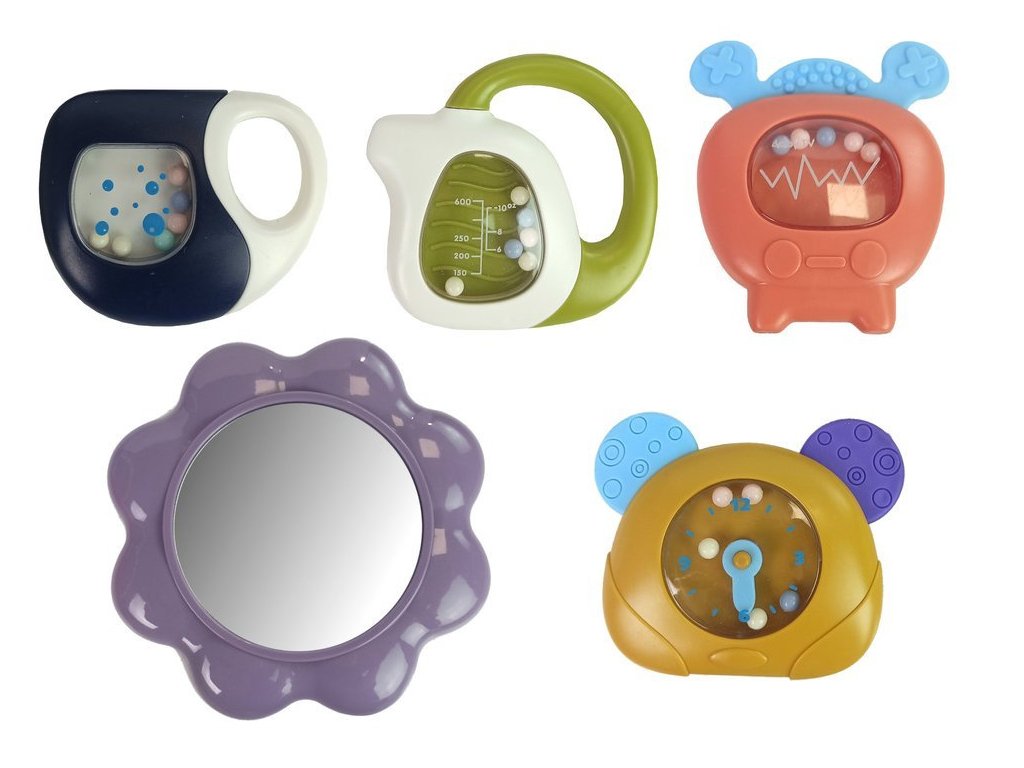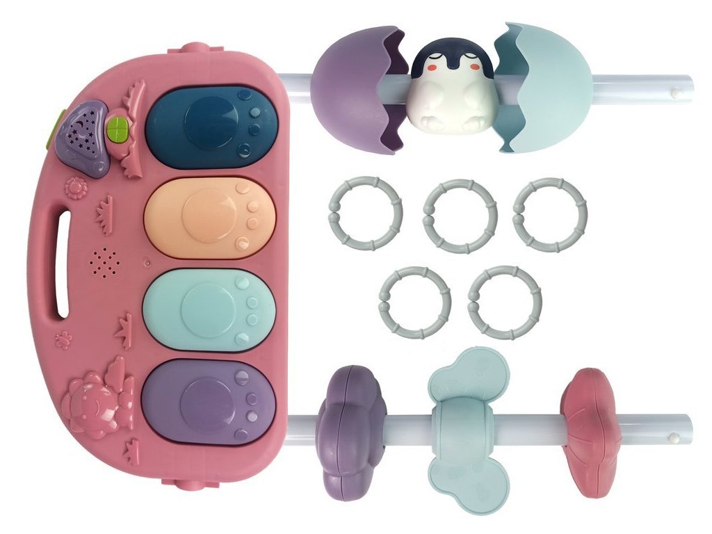 Živé barvy a vzory přitáhnou pozornost toho nejneklidnějšího miminka. Sada obsahuje piáno na baterie, po stisknutí kláves uslyšíte řadu zvuků vycházejících z reproduktoru. Nad ním visí různá chrastítka ve tvaru hodinek a televize s gumovými koncovkami, které mohou sloužit jako kousátko. Díky různým prvkům se batole naučí tvary figurek nebo vybavení.