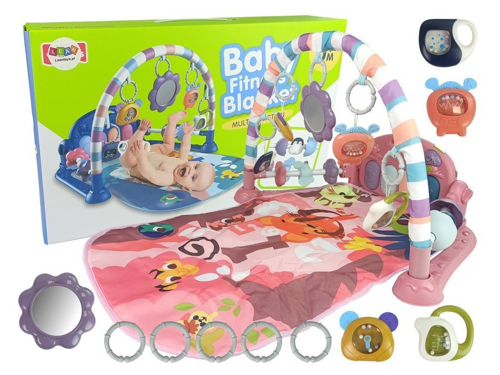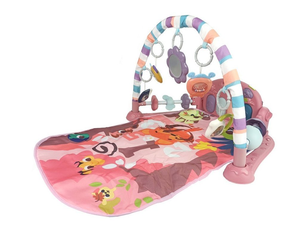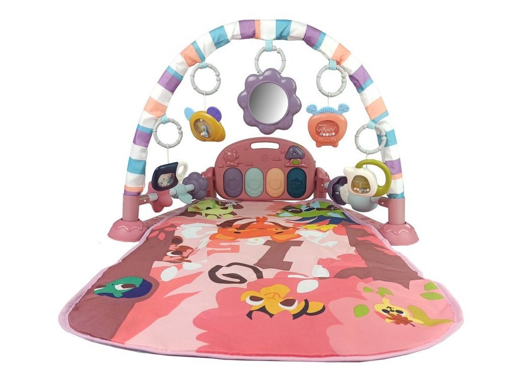 Dětská podložka s pěnovými chrastítky, kousací kroužek, zrcátko, zvuk růžové