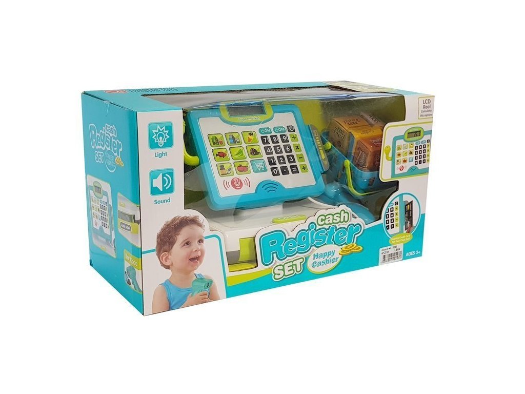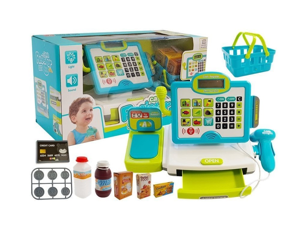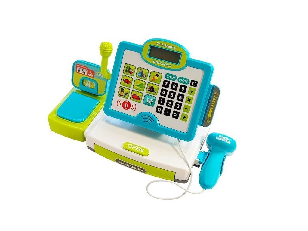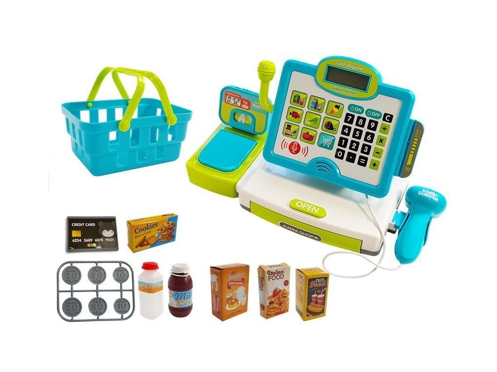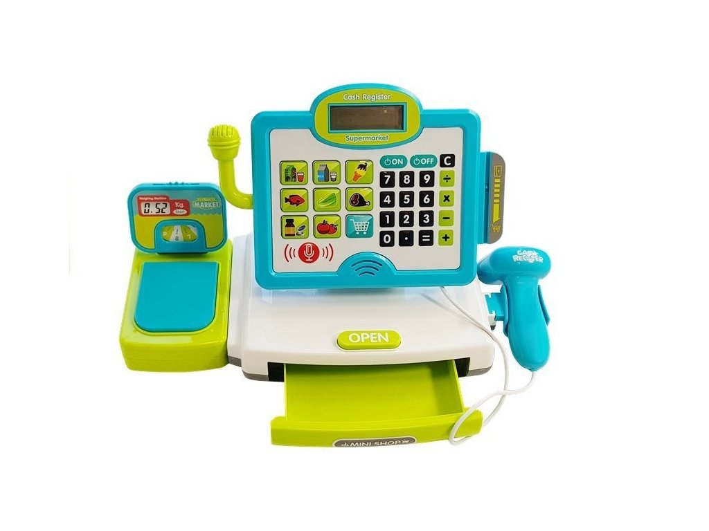Prezentovaná hračka je nejbezpečnější možná hračka, nemá ostré konce, je vyrobena z nejkvalitnějšího materiálu. Pokladna je vedena v pěkných barvách, v odstínech modré a zelené. Určitě upoutá pozornost vašeho dítěte a povzbudí je ke hře. Pokladna má další prvky, jako je čtečka karet a skener. Panel pokladny obsahuje obrázky s produkty a skutečnou kalkulačku.