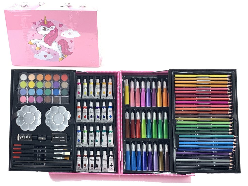 Kreativní zábava pro každého - kompletní sada pastelek, barev, fixů! Naše sada v kufru s rozkošným jednorožcem má všechny potřebné umělecké nástroje v různých barvách. Sada je velká a má celkem 145 prvků, aby dítěti při tvorbě jeho výtvorů nic nechybělo. Vše v jednom pouzdře s potiskem jednorožce, který děti milují.