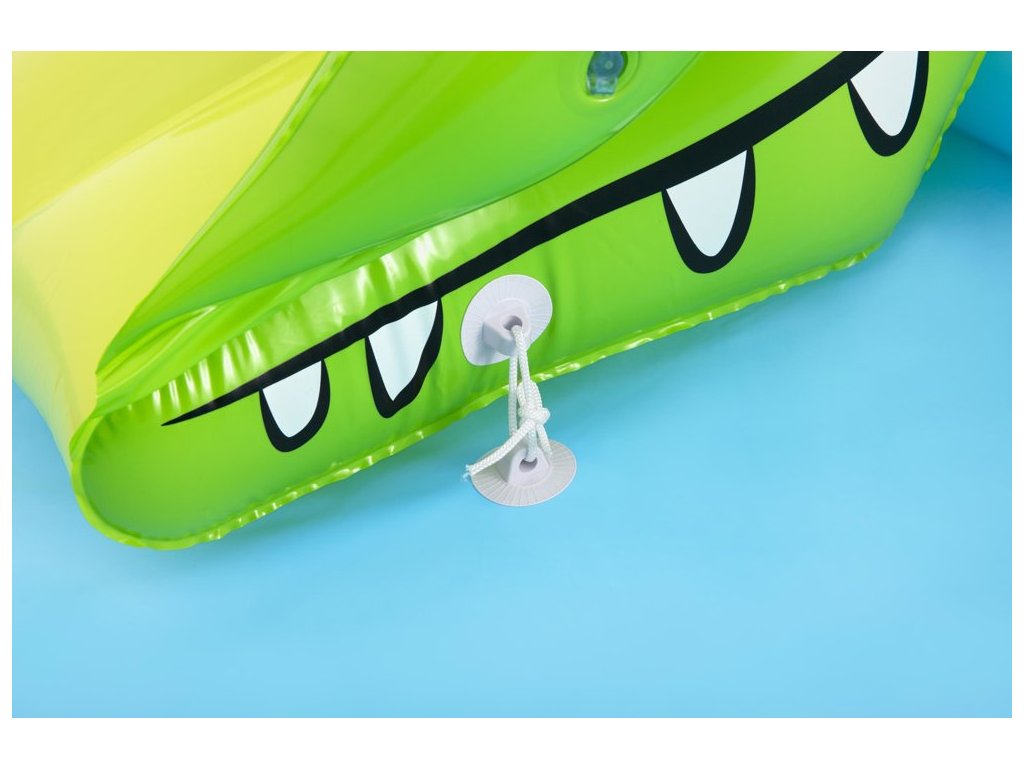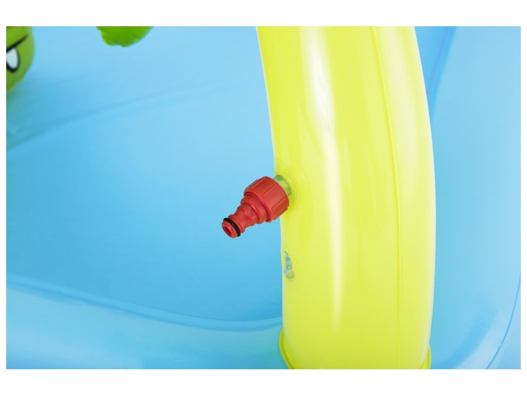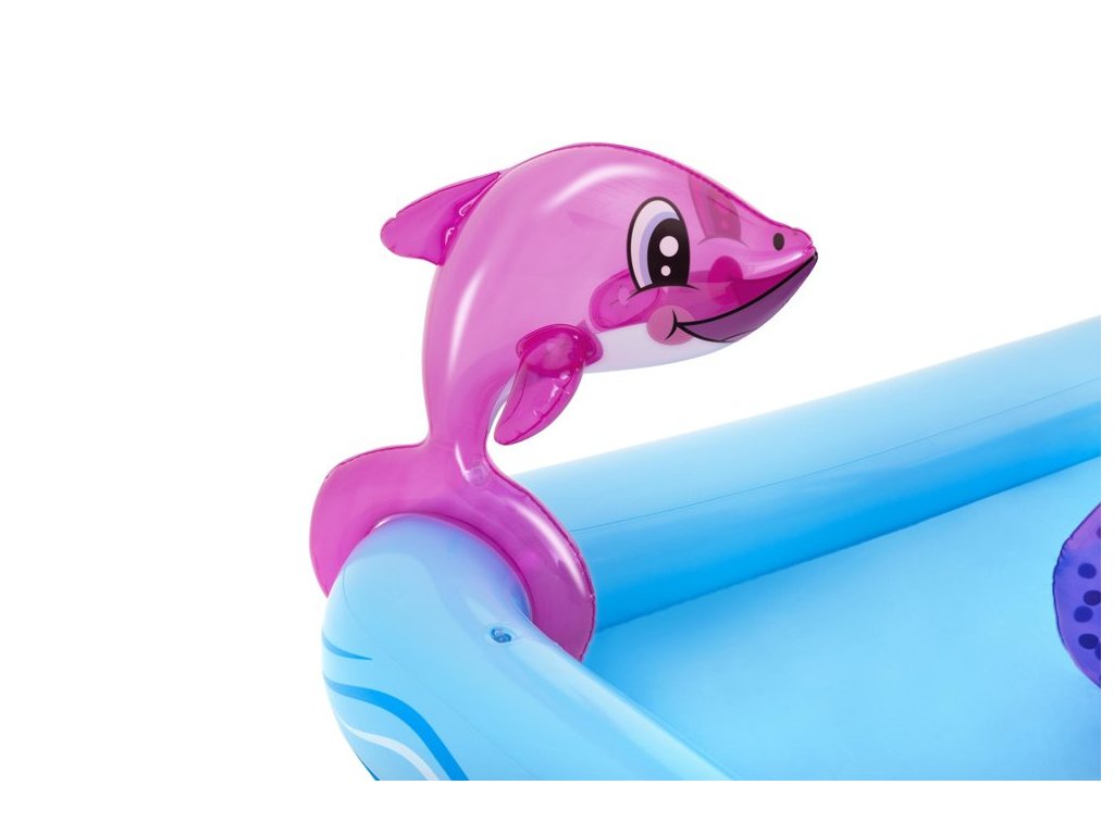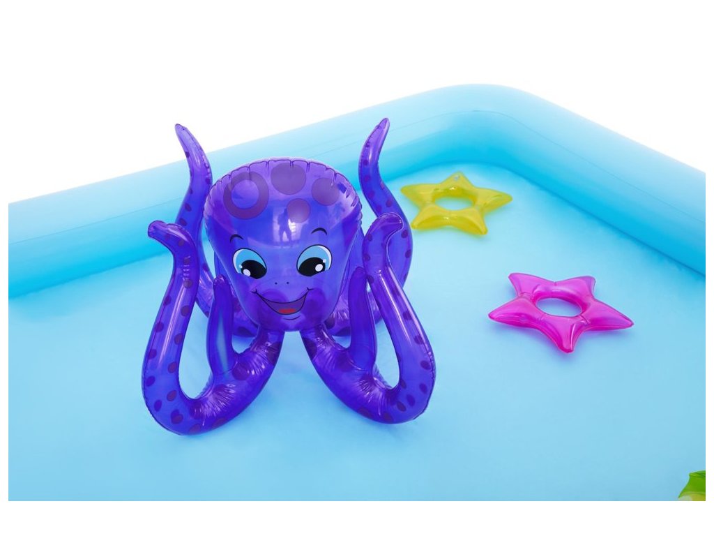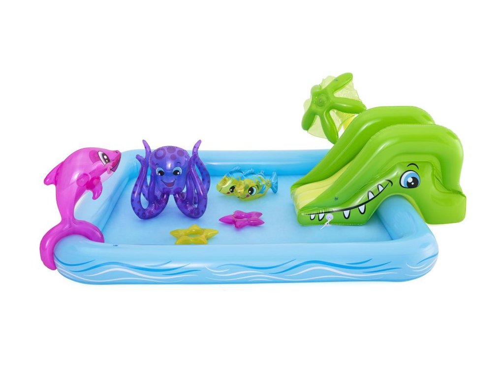 Rádi byste svému dítěti dopřáli nezapomenutelnou zábavu v soukromí vaší zahrady? Nafukovací hřiště z něj udělá skutečné centrum zábavy pro vaše dítě. Bazén s nafukovacími oceánskými obydlí, nafukovací skluzavkou a vodní fontánou jistě potěší vašeho nejmenšího a stane se jeho oblíbeným místem na hraní. Bazén je vyroben z měkkého, ale odolného materiálu a je maximálně bezpečný pro nejmenší děti. Hlavními lákadly jsou odnímatelná nafukovací skluzavka a palma, ze které po napojení na zahradní hadici poteče voda.
