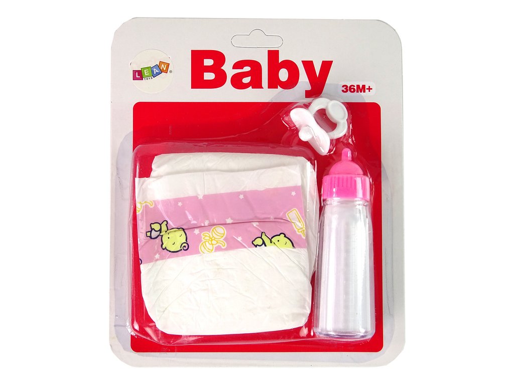 Sada doplňků pro panenku je mimořádně roztomilým doplňkem, který zavede malé holčičky do světa hrací se domácnosti a rodinné péče. Sada obsahuje průhlednou lahvičku s bílým vnitřkem imitujícím mléko, bílou panenku a rozkošnou bílou plenku s růžovými motivy.