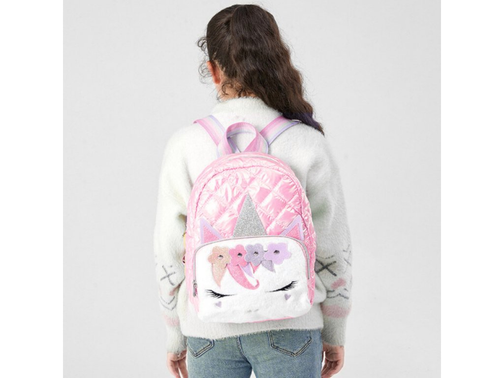 Model je vyroben z lehkého, ale odolného materiálu odolného vůči nečistotám a poškození. Přední stranu zdobí filcová aplikace s motivem jednorožce, květinami, oušky a třpytivým rohem. Batoh má prostornou hlavní komoru, menší vnitřní kapsu a vnější kapsu na zip, která umožňuje pohodlné uspořádání věcí. Nastavitelné popruhy zajišťují pohodlí při používání a přizpůsobení výšce dítěte.