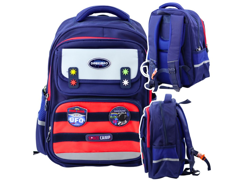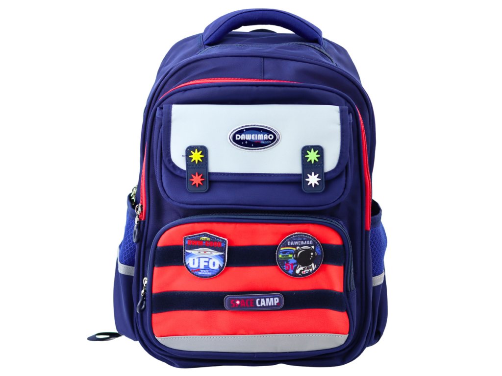 Batoh má prostornou hlavní komoru s vnitřní přepážkou, která usnadňuje organizaci knih a sešitů. Navíc má dítě k dispozici: druhou menší přihrádku, přední kapsu a malou kapsičku s klopou na suchý zip. Na přední straně batohu jsou našity pásky na suchý zip, na které lze připevnit ozdobné prvky - díky tomu může dítě dát batohu individuální charakter. Sada obsahuje nášivky a aplikace s vesmírnými motivy, jako jsou planety, rakety a odznaky "UFO", které může dítě libovolně měnit.