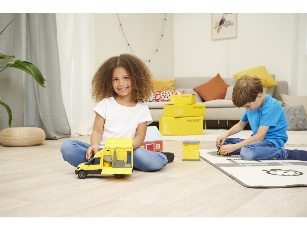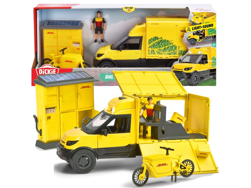 Hračka DHL van od Dickie Toys má futuristický.futuristický design s poutavou žlutou karoserií. Má otevírací boční klapky, za nimiž se skrývá malé zařízení na třídění balíků. Je také vybaven řadou realistických světelných a zvukových efektů.
