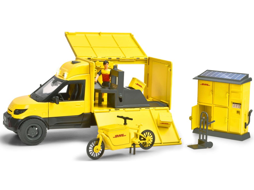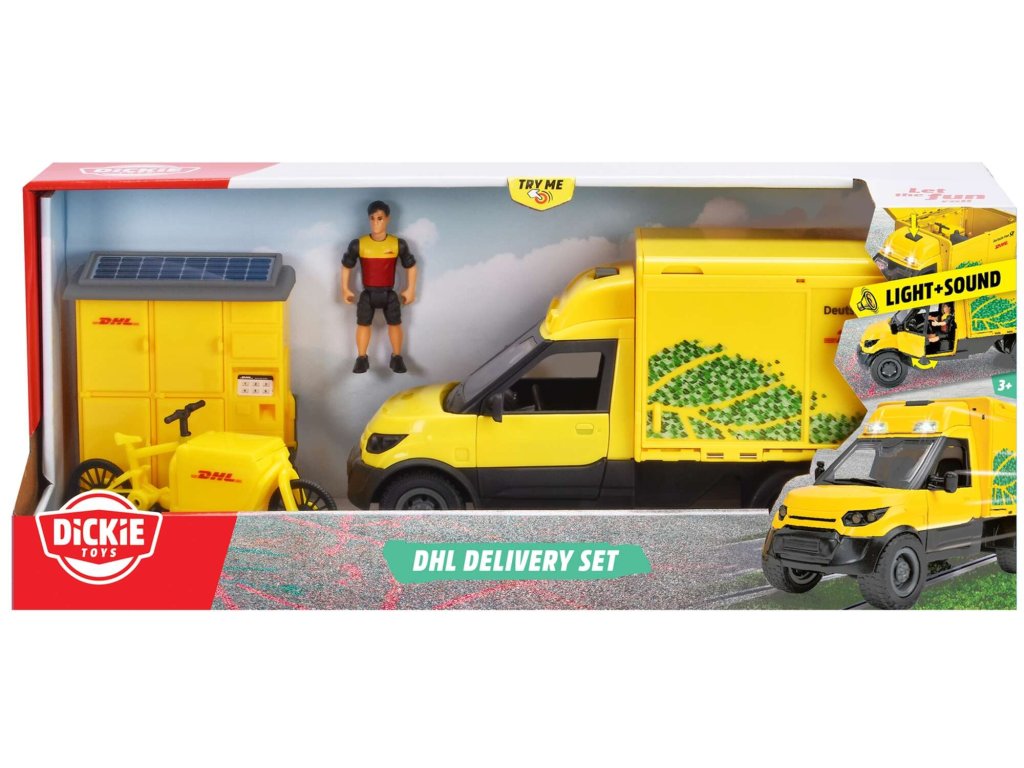 DHL žlutá dodávka set vozidlo s figurkou balíku kolo kurýrní kolo + příslušenství světelný zvuk