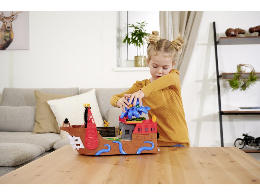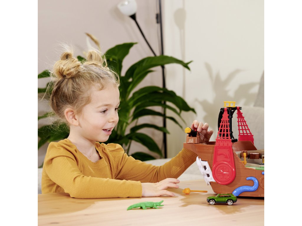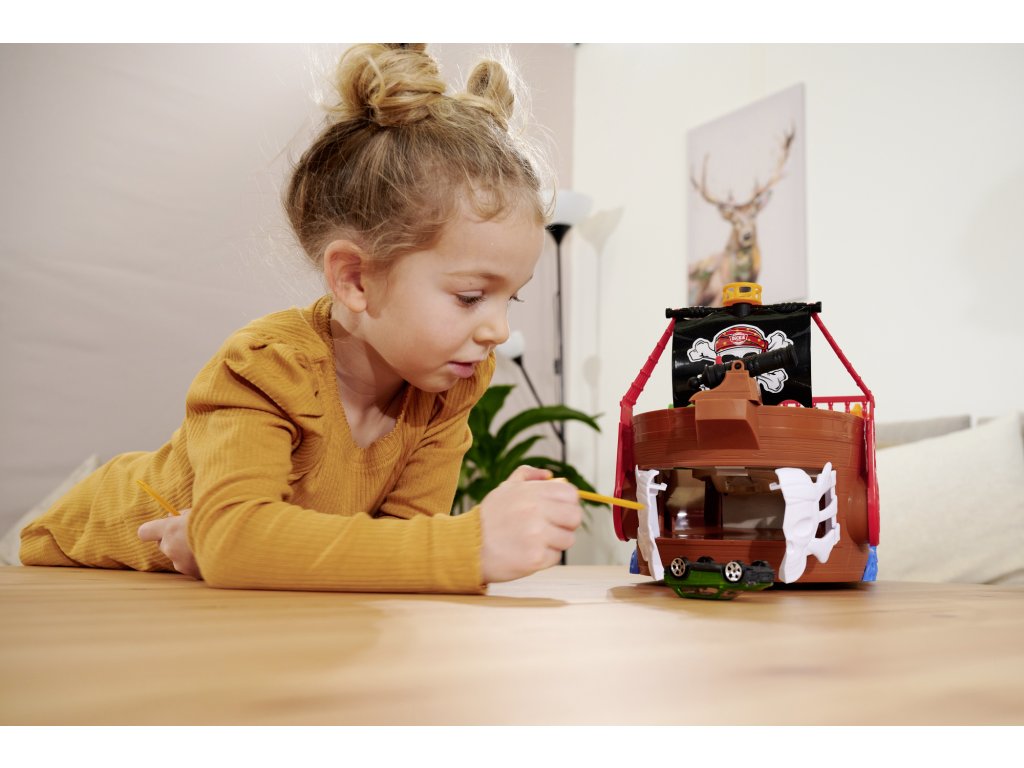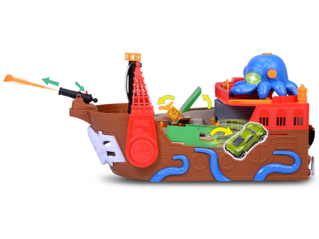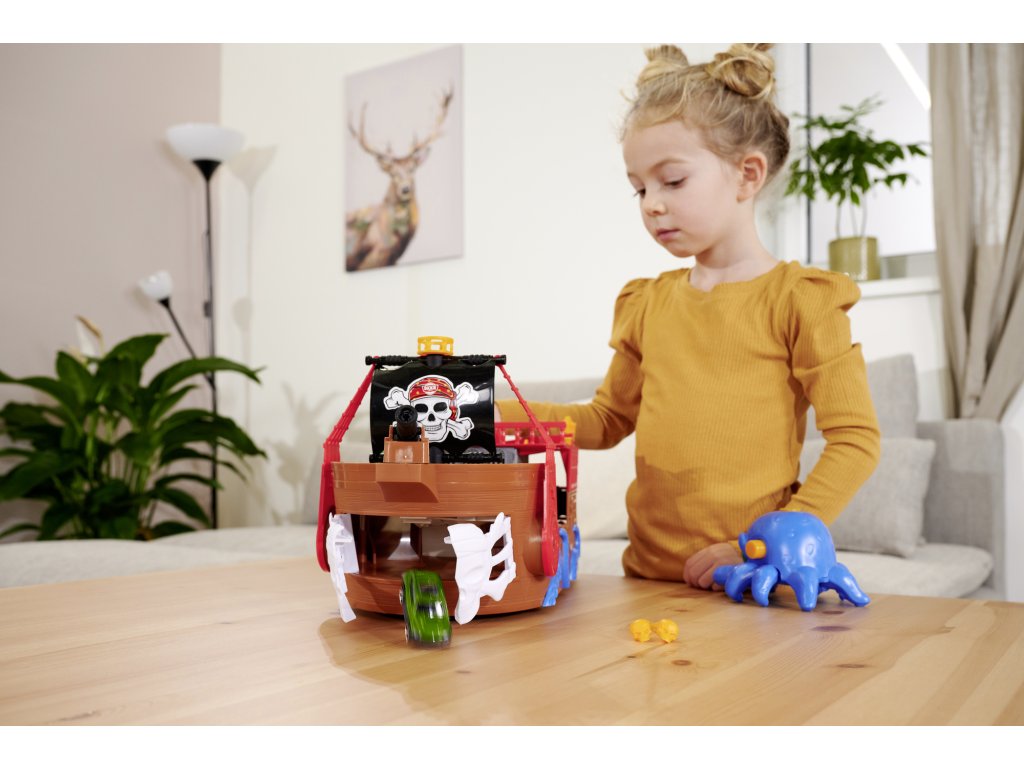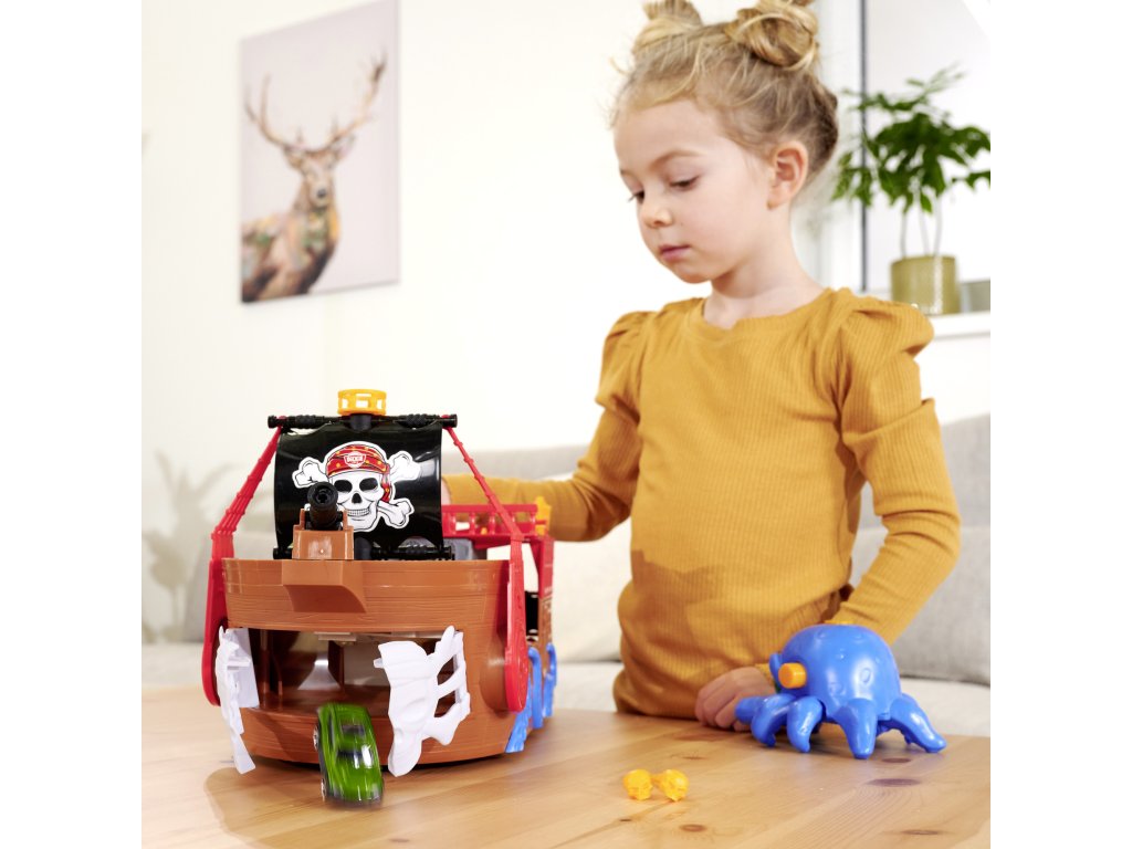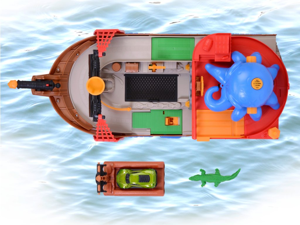 Tato pirátská loď je mimořádná hračka o délce 41,5 cm , která kombinuje svět pirátů, závodění a vodních experimentů. Není to jen plovoucí loď se světelnými a zvukovými efekty, ale také interaktivní autodráha a akční herní základna.