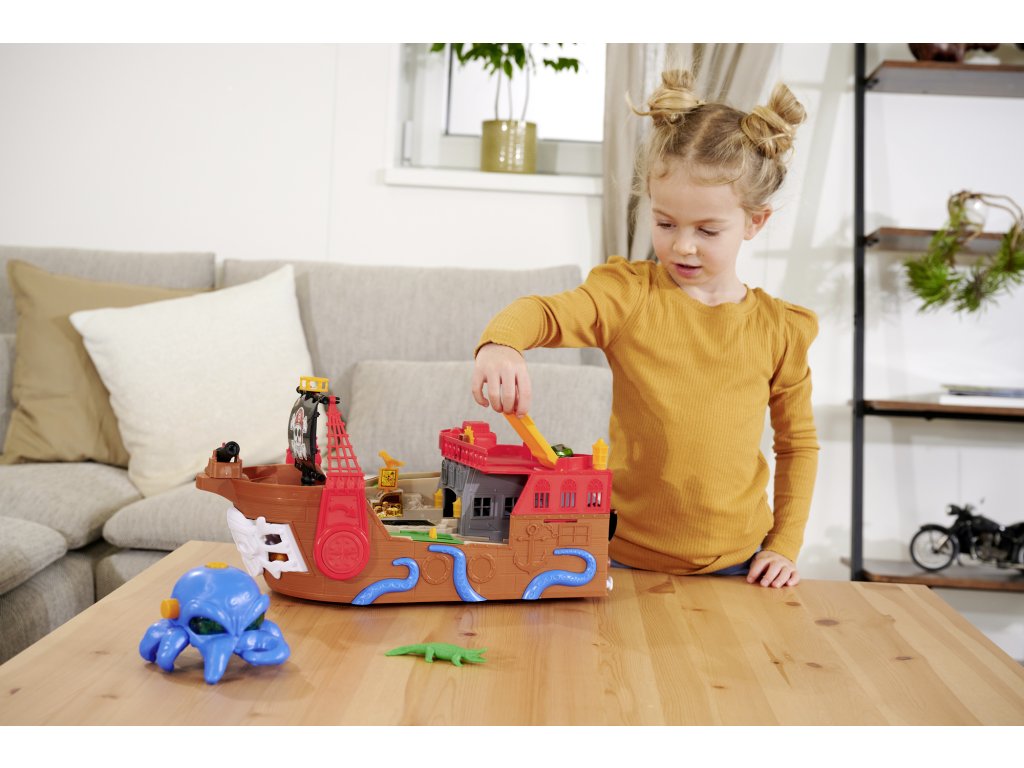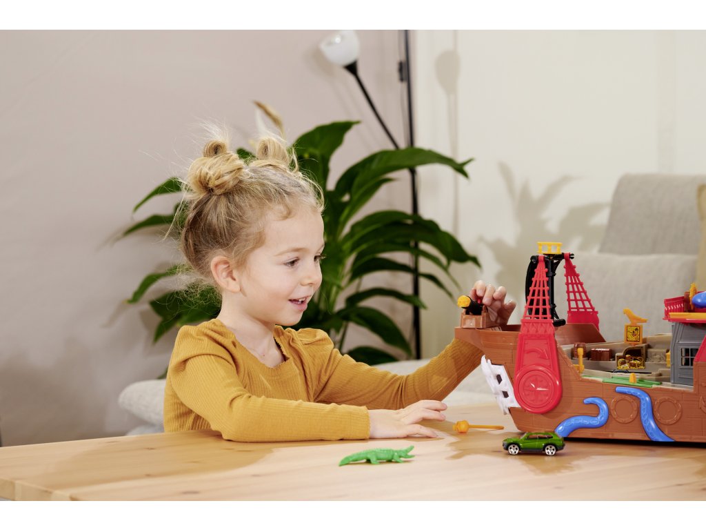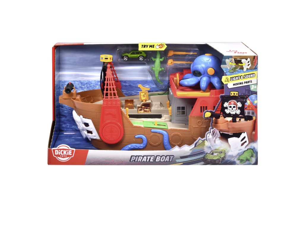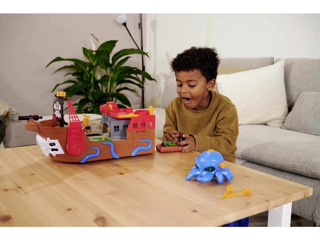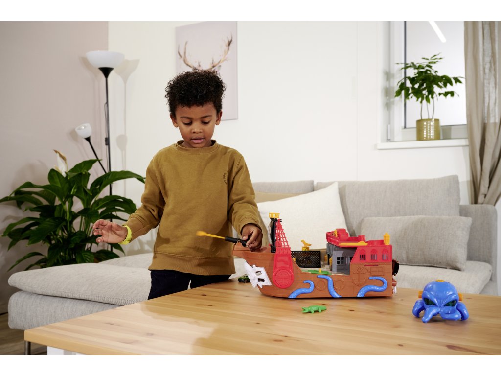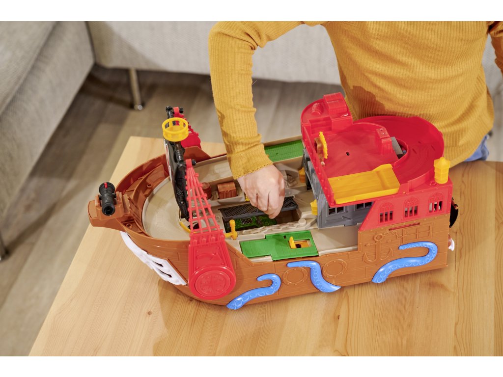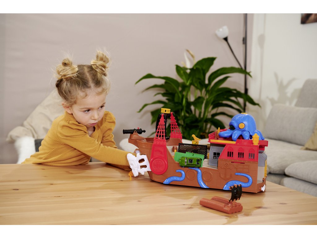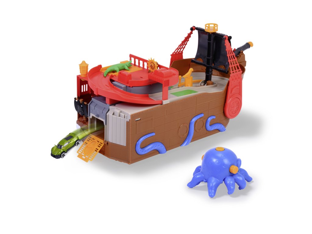 Tato pirátská loď je mimořádná hračka o délce 41,5 cm , která kombinuje svět pirátů, závodění a vodních experimentů. Není to jen plovoucí loď se světelnými a zvukovými efekty, ale také interaktivní autodráha a akční herní základna.
