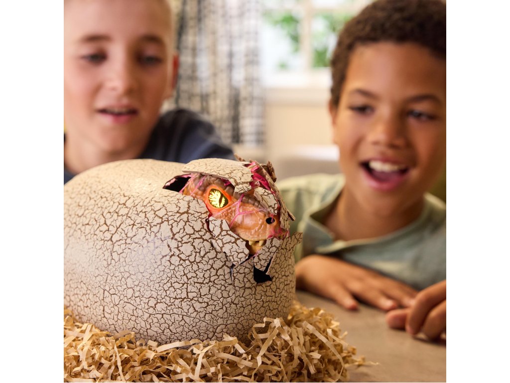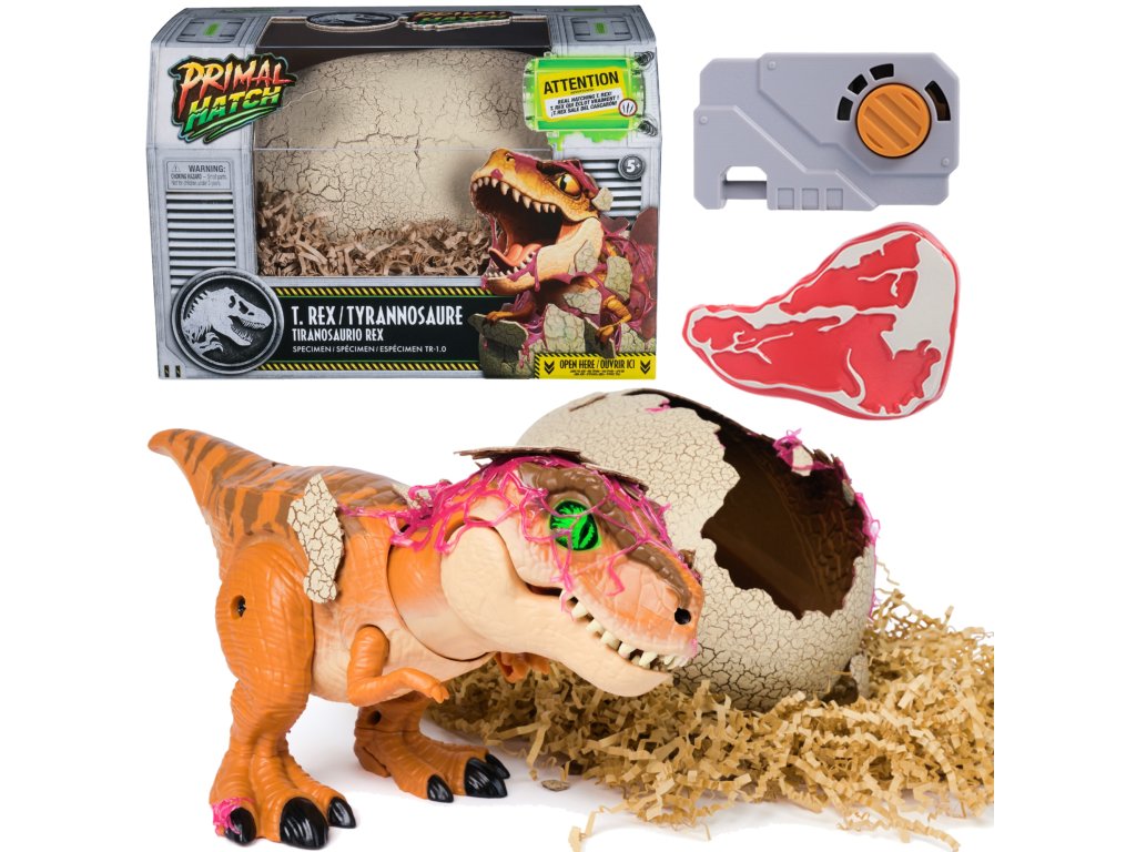 Zábava začíná s vejcem. Stačí několikrát poklepat na skořápku, abyste stimulovali malého dinosaura uvnitř. Vajíčko začne praskat, třást se a pomalu se otevírat a z úlomků skořápky a hlenu se vynoří miniaturní T-Rex. Je to velkolepý okamžik, který vypadá jako scéna přímo z Jurského světa.