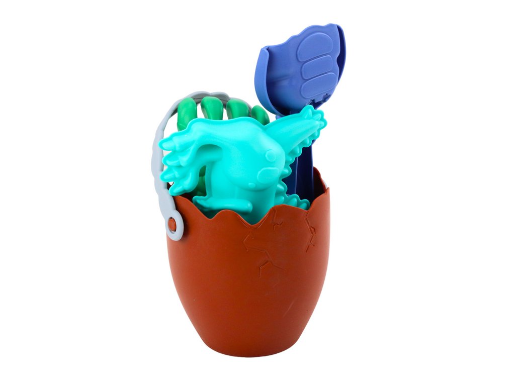 Sada hraček do písku s motivem dinosaurů je neobyčejným dobrodružstvím ve světě prehistorických tvorů. Ústředním prvkem je kyblík ve tvaru vaječné skořápky, který slouží jak k ukládání nástrojů, tak k vytváření pískových struktur. Přiložené hrabičky a lopatka umožňují přesné vyřezávání a vytváření detailů.
