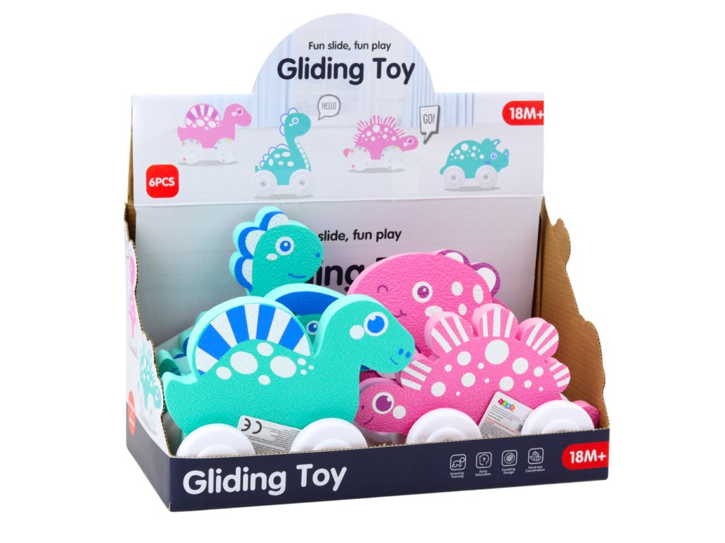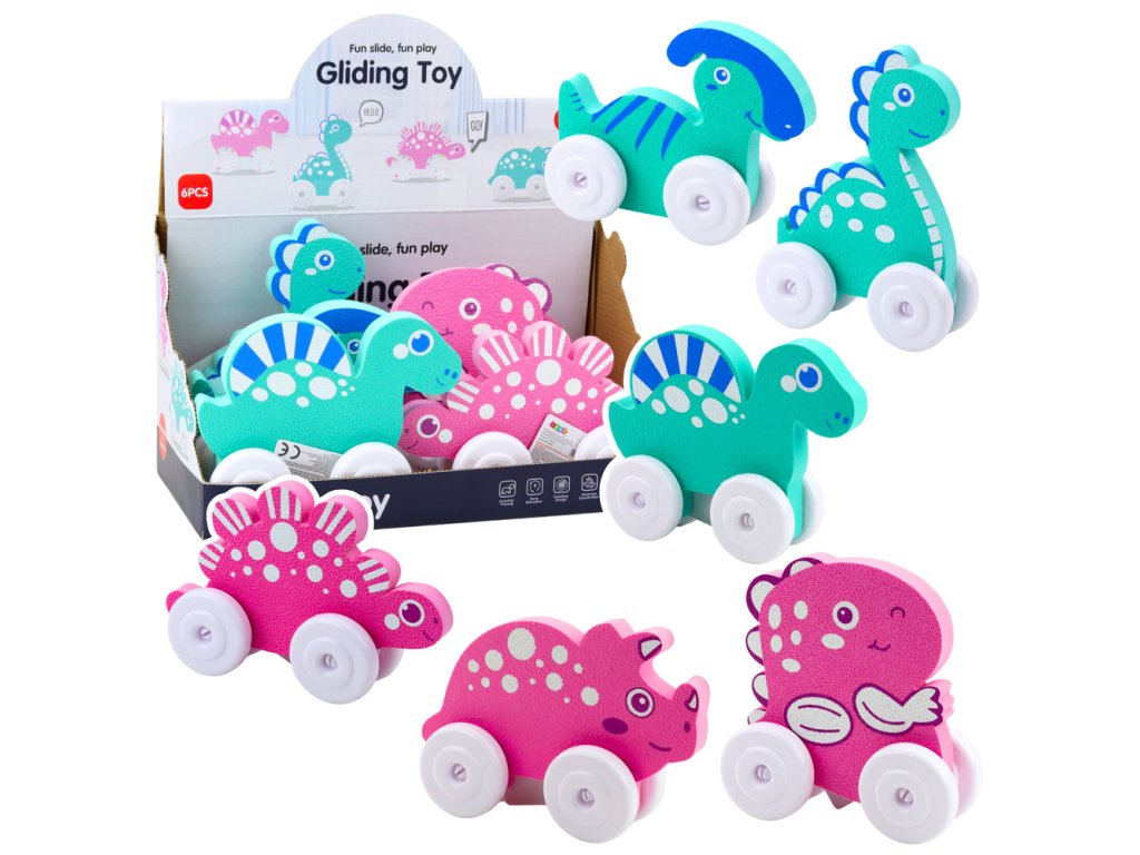 Díky kolečkům se hračky volně otáčejí a lehká konstrukce znamená, že je dítě může snadno tlačit a brát si je všude s sebou. Hračka rozvíjí motoriku, koordinaci ruka-oko a kreativitu při vymýšlení dobrodružství za účasti veselých dinosaurů. Pěnový materiál je měkký a bezpečný a jeho struktura je odolná proti deformaci a snadno se udržuje v čistotě.