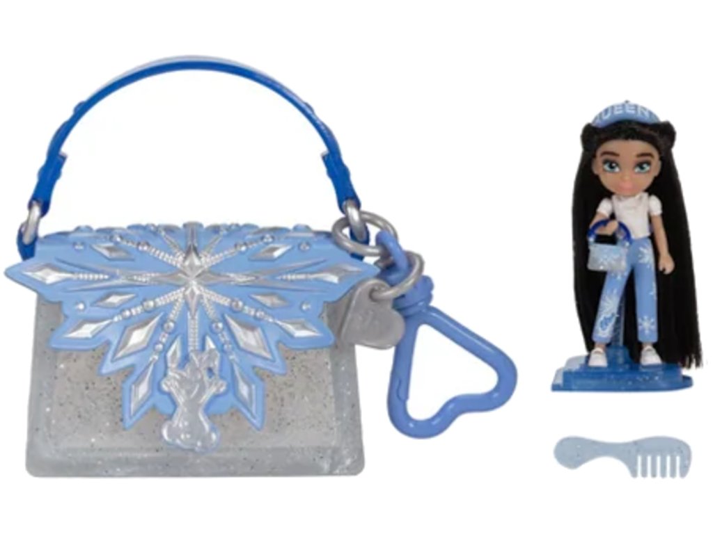Sada obsahuje mini panenku s dlouhými tmavými vlasy, oblečenou v modrobílém oblečku s motivem sněhových vloček. Tenisky a mini kabelka s vločkami doplňují vzhled.