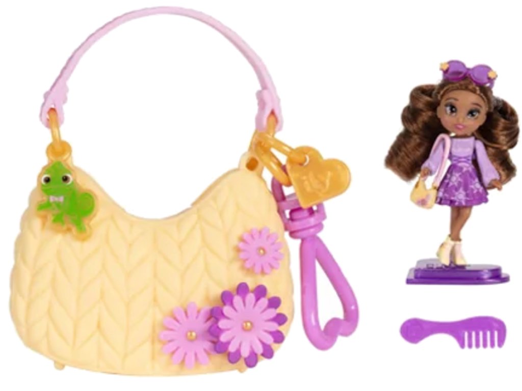 Sada obsahuje mini panenku s dlouhými hnědými vlasy, oblečenou do fialového oblečku s motivem sluníčka. Vzhled doplňují žluté boty a mini zlatá kabelka.