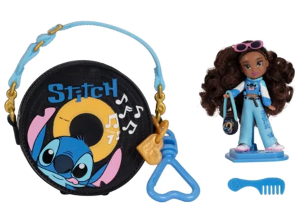 Sada obsahuje mini panenku s dlouhými hnědými vlasy, oblečenou v modrém oblečku s motivem Stitch. Tenisky a mini kabelka s motivem Stitch dotvářejí vzhled.
