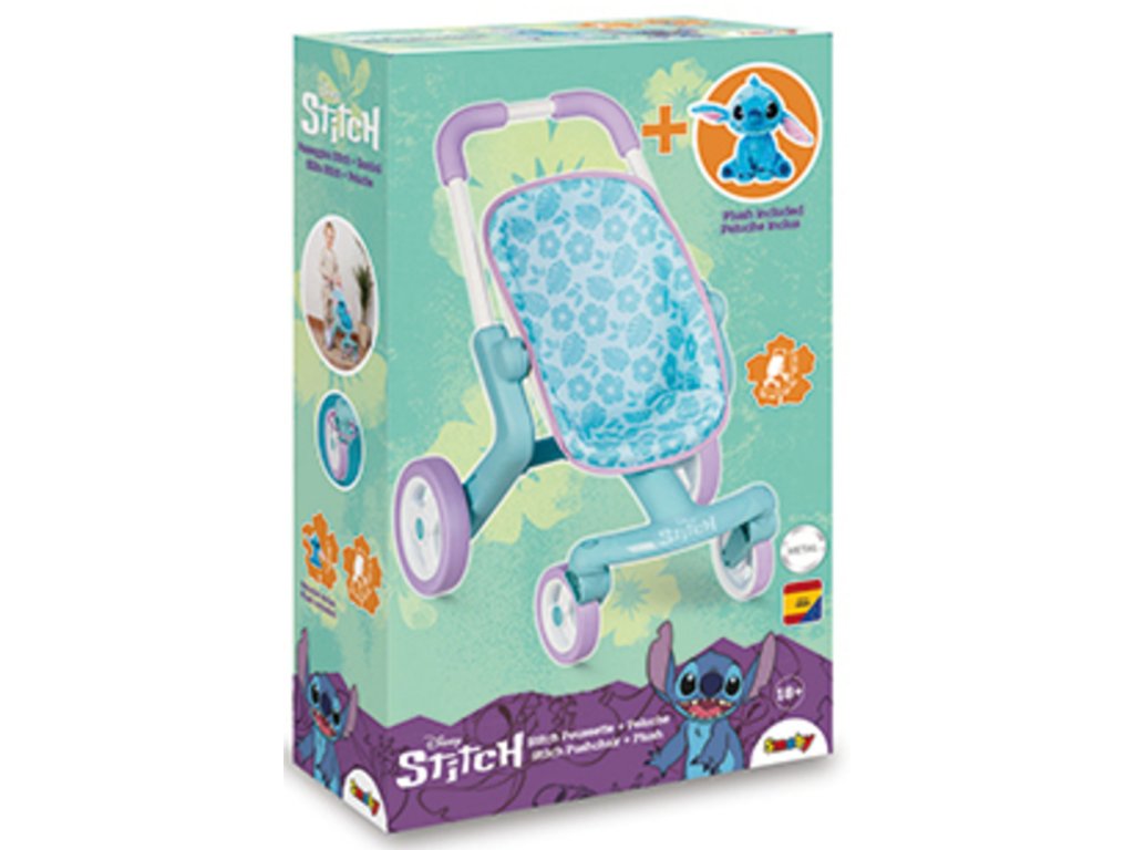 Kočárek má pastelovou barvu a jeho látku zdobí okouzlující květinové a listové vzory. Má ocelový rám a pohodlnou rukojeť , díky čemuž je vhodná pro děti starší 18 měsíců. Látka je měkká na dotek a snadno se čistí. Sada obsahuje také plyšovou hračku 25 cm Stitch . Perfektně se vejde do kočárku.