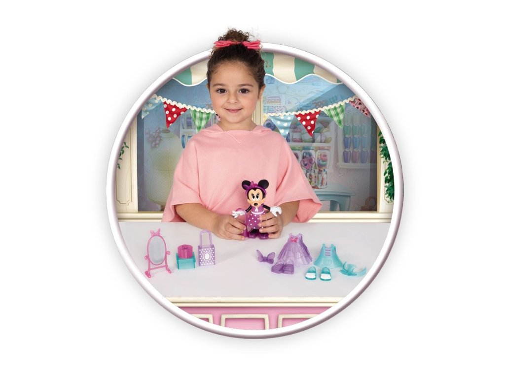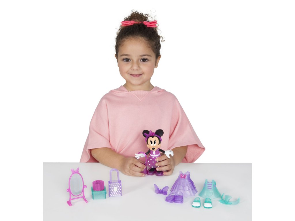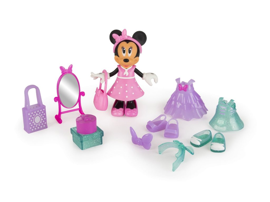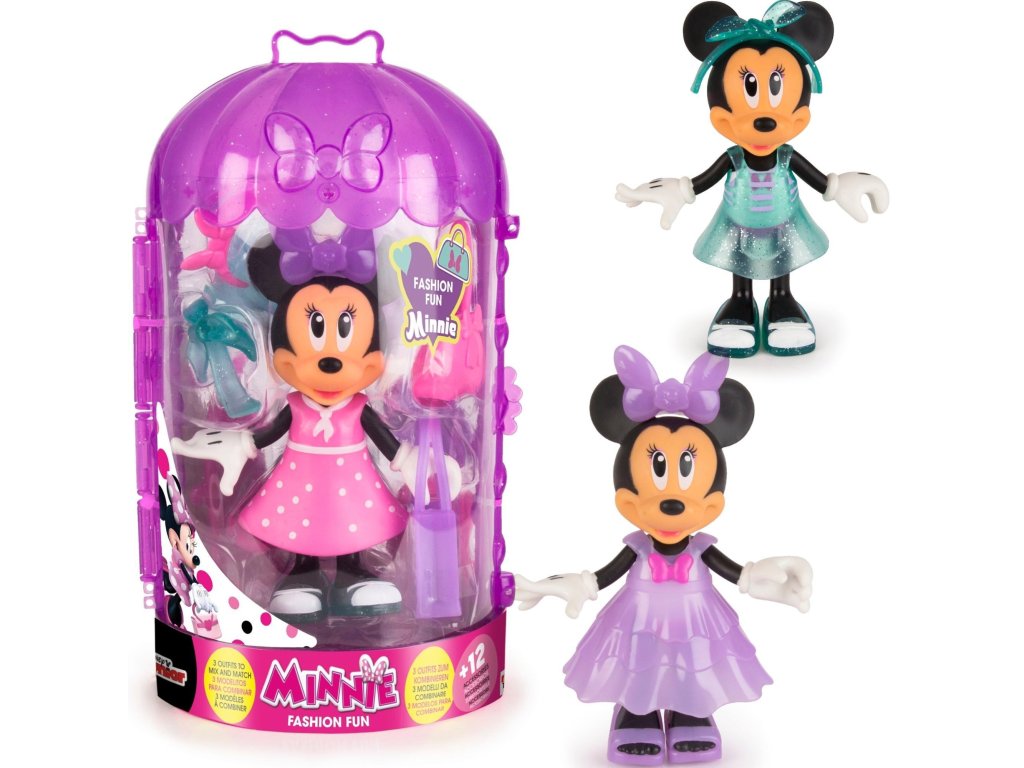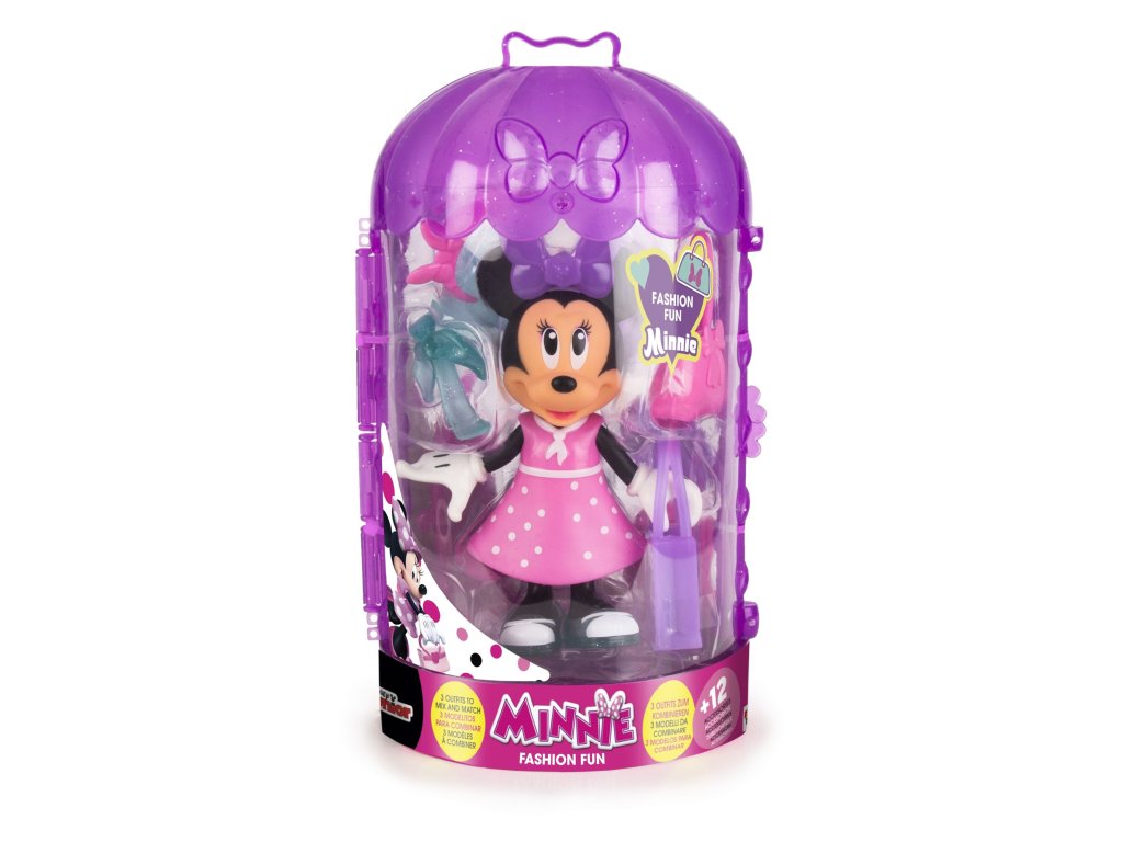 Sada „Módní zábava“ obsahuje 14 doplňků: 3 páry bot , 3 šaty, 2 krabice, 2 tašky, 2 čelenky, zrcátko a mašli. Oblečky mají praktické patentky, které umožňují snadné oblékání milované Minnie Mouse. Hračka je balena v estetickém balení s patentkami a průhlednou vitrínou, takže je ideální jako dárek a bude skvěle vypadat na poličce.