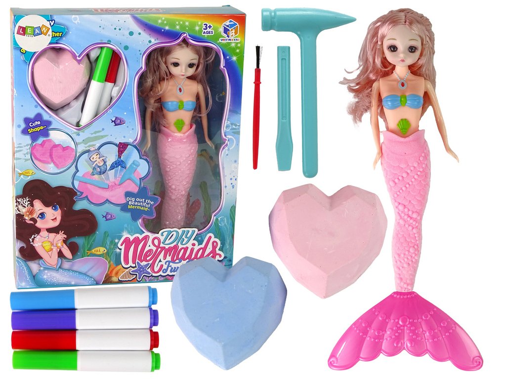 Tato vícedílná sada s mořskou pannou rozvine kreativitu a představivost vašeho dítěte. Hrajte si se svou malou mořskou vílou, ozdobte její ocas a objevte, co skrývá v malých kamenech ve tvaru srdce. Spojíte zábavu z vykopávek s rozvojem uměleckých dovedností.
