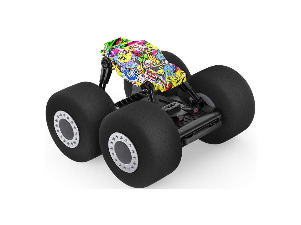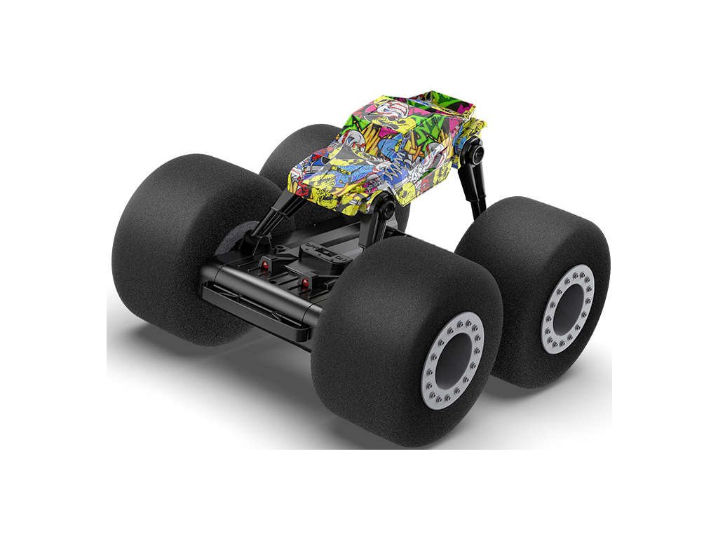 Díky velkým, pěnovým pneumatikám nemá vozidlo problém překonávat překážky a náročné kaskadérské kousky!