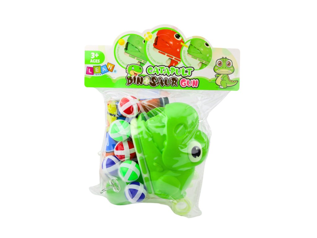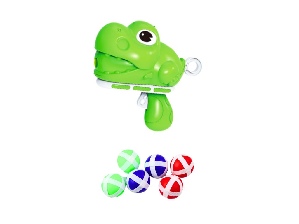 - Pistole ve tvaru dinosaura s pružinovým mechanismem, který umožňuje snadné nabíjení a odpalování koulí.