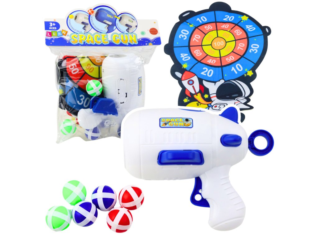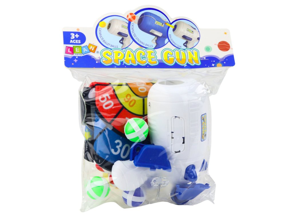 Ergonomická zbraň ve tvaru vesmírné lodi, vyrobená z odolného plastu, umožňuje snadné napnutí pružinového mechanismu a přesnou střelbu jedné ze šesti přiložených kuliček na suchý zip. Po odpálení se kuličky přilepí na povrch terče, což usnadňuje počítání bodů a zabraňuje jejich ztrátě. Háček pro zavěšení terče umožňuje rychlou montáž na zeď, dveře, nebo desku a fóliové balení zaručuje pohodlné skladování a přepravu celé sady.