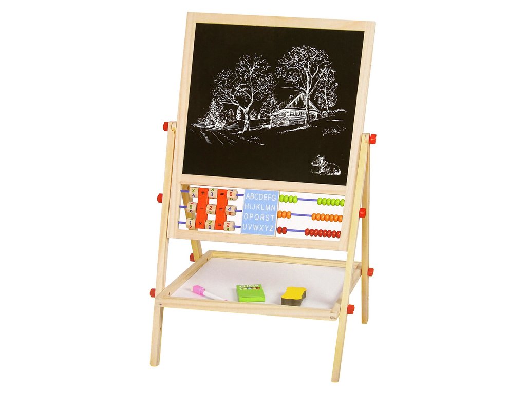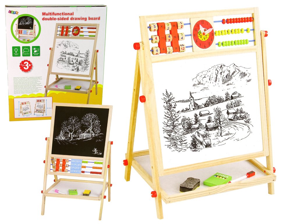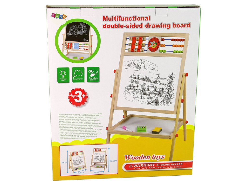 Dřevěná deska je jedinečná a všestranná vzdělávací hračka. Je reverzibilní a přináší dětem dvojnásobnou dávku zábavy a učení. Na jedné straně je počítadlo a plná abeceda, která vám umožní naučit se počítat a psát písmena. Dá se na něj psát i křídou, která rozvíjí dětskou kreativitu.