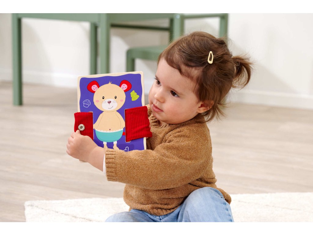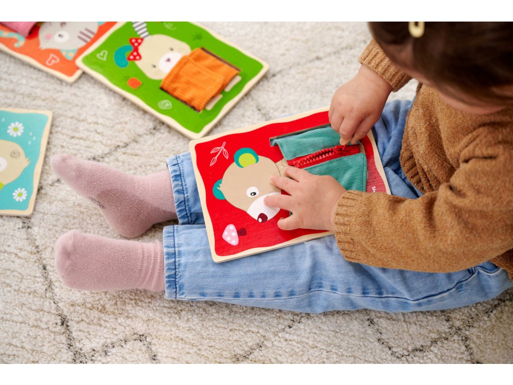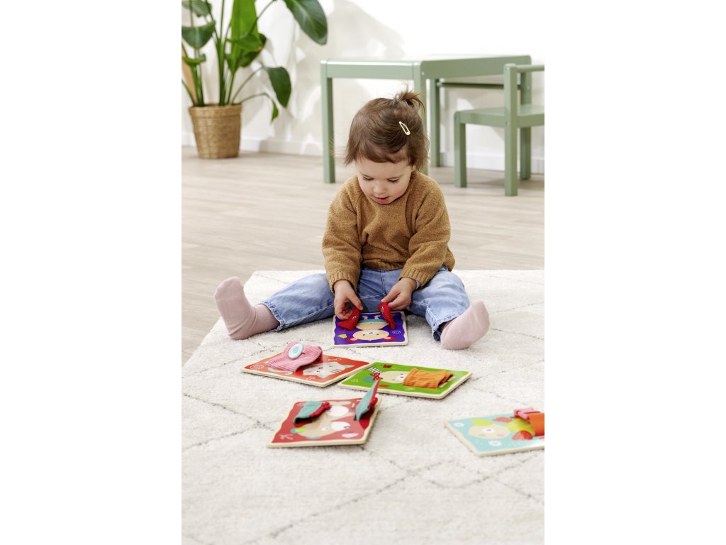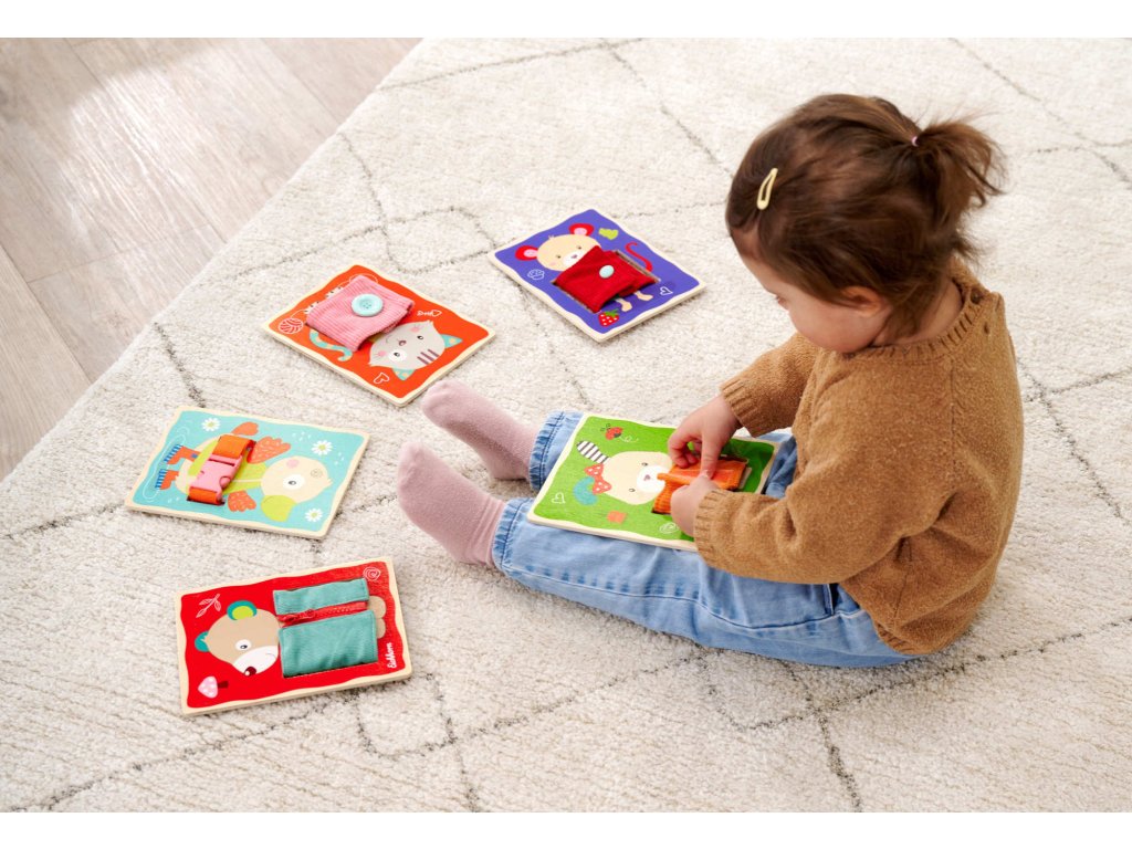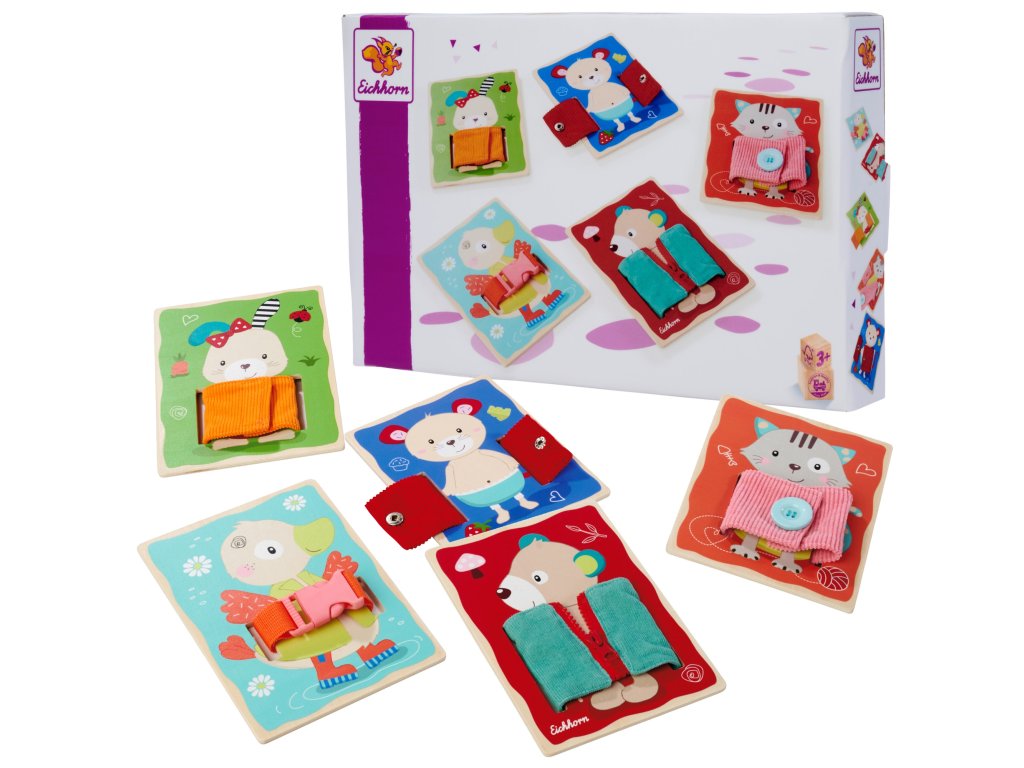Sada se skládá z 5 barevných desek s různými zvířátky. Každá deska má potah, který je potřeba upevnit jiným způsobem. Naši nejmenší se skvěle zabaví při rozepínání a zapínání zvířátek.