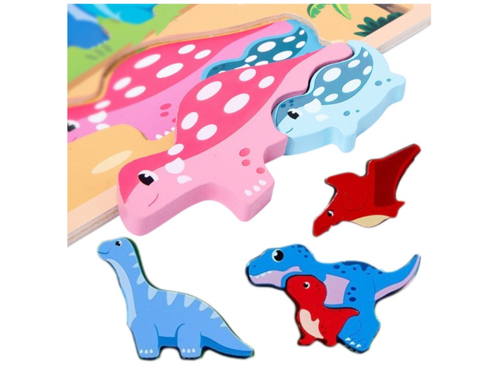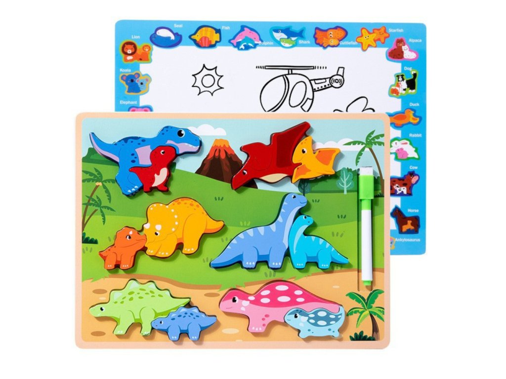 Dřevěné vzdělávací puzzle s dinosaury je všestranná hračka 2 v 1, která kombinuje učení se poznávání tvarů s kreativní uměleckou hrou. Tabule obsahuje 12 barevných dinosaurů, které dítě přiřazuje na příslušná místa, učí se logickému myšlení, koncentraci a rozvíjí manuální dovednosti.