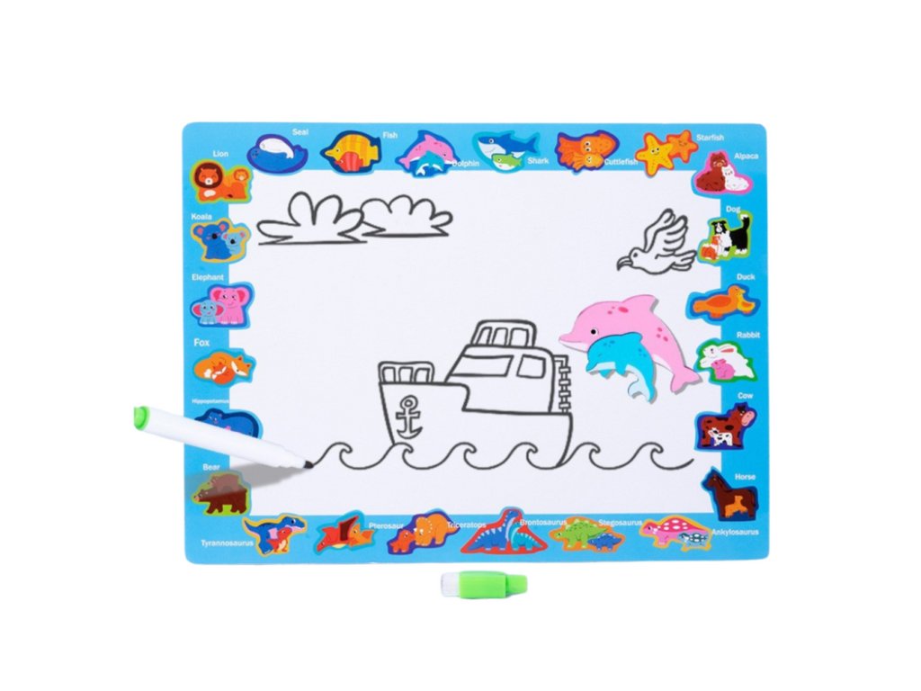 Na zadní straně tabule je 30 x 22,5 cm stíratelné kreslicí prkno, na kterém si dítě může vytvářet vlastní kresby pomocí přiloženého fixu. Je to skvělý způsob, jak rozvíjet představivost a procvičovat jemnou motoriku.