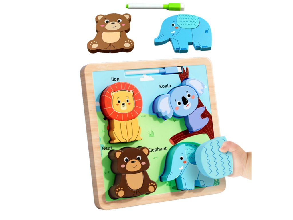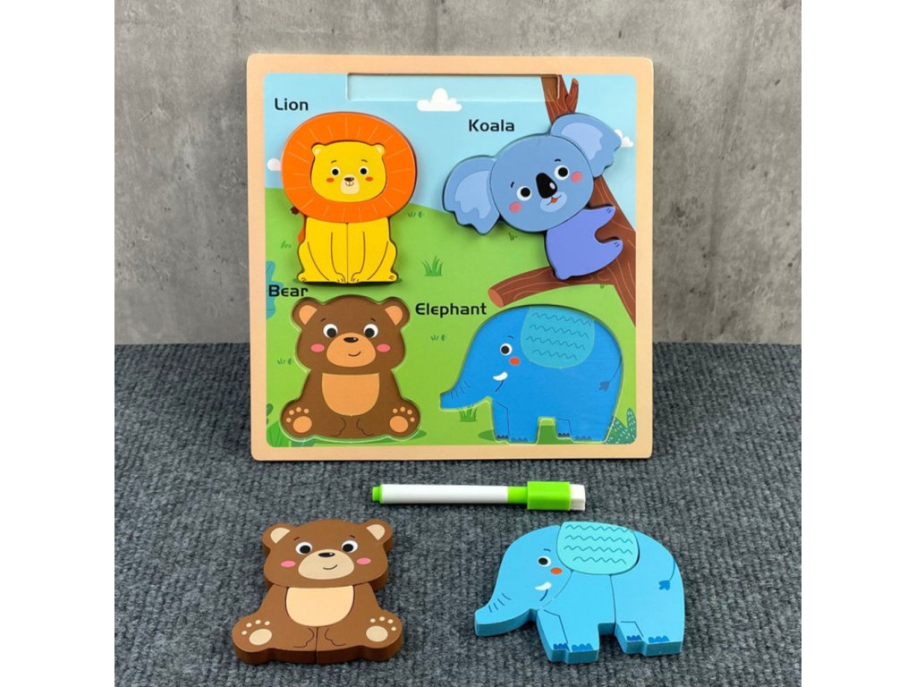 Dřevěné vzdělávací puzzle s motivem divokého zvířátka je všestranná hračka, která rozvíjí manuální a kognitivní dovednosti dítěte. Deska obsahuje čtyři barevné figurky divokých zvířat: lva, koaly, medvěda a slona, které lze přiřadit k příslušným místům. Každé zvířátko se skládá z několika velkých prvků, ideálních pro malé ruce.