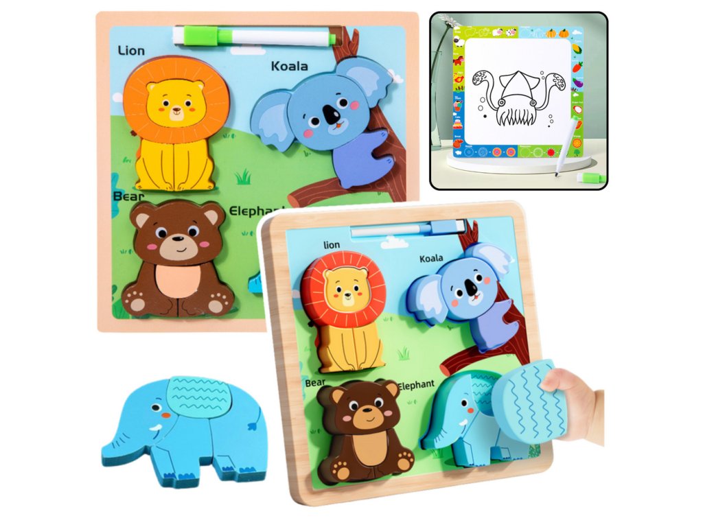 Na zadní straně desky je plocha pro kreslení suchým mazacím fixem, který dává dítěti možnost procvičit si kreslení, psaní a rozvíjet kreativitu. Díky tomu hračka slouží jako výukové puzzle a tabule na psaní a kreslení.