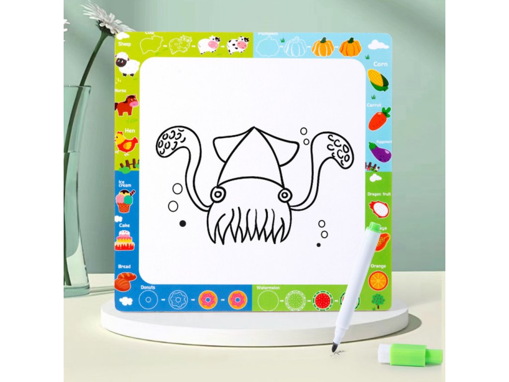 Na zadní straně desky je za sucha stíratelná plocha pro kreslení, která umožňuje dítěti procvičovat kreslení a psaní pomocí přiloženého fixu. Jedná se o praktickou funkci, která rozvíjí kreativitu a manuální zručnost dítěte.