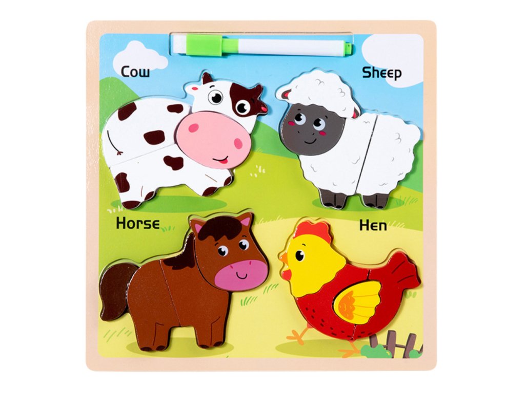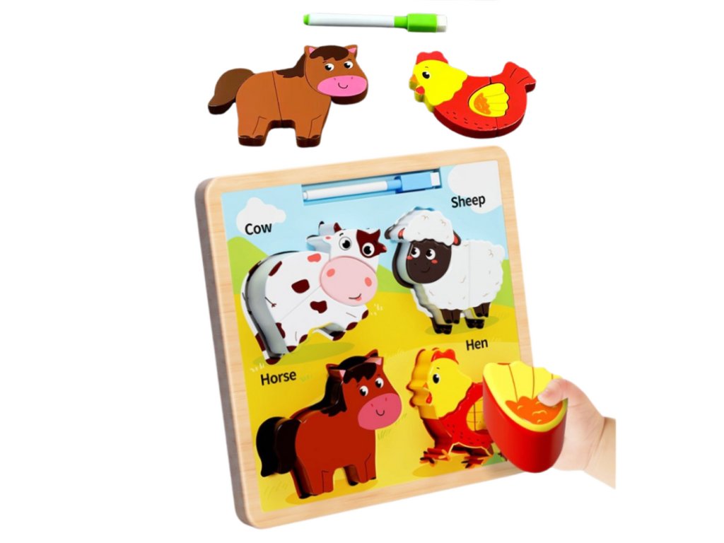 Dřevěné vzdělávací puzzle s mazlíčky je skvělý způsob, jak spojit učení se zábavou. Na desce jsou čtyři dětem známá zvířátka ze dvora: kráva, ovce, kůň a slepice. Každé zvířátko se skládá z několika prvků, které je potřeba sladit na vhodné místo, což podporuje rozvoj koordinace oko-ruka a logického myšlení.