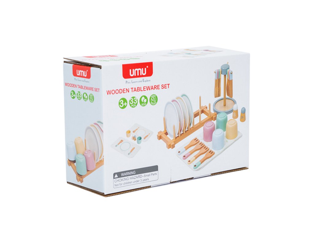 Výrobek je vyroben z bezpečného a odolného dřeva, odolného proti poškození a intenzivnímu používání. Sada díky svým pastelovým, estetickým barvám vybízí ke hře a zároveň učí sladění barev, organizaci prostoru a pravidlům prostírání stolu. Je to nejen skvělá zábava, ale také vynikající vzdělávací nástroj podporující rozvoj fantazie, sociálních dovedností a koordinace ruka-oko.