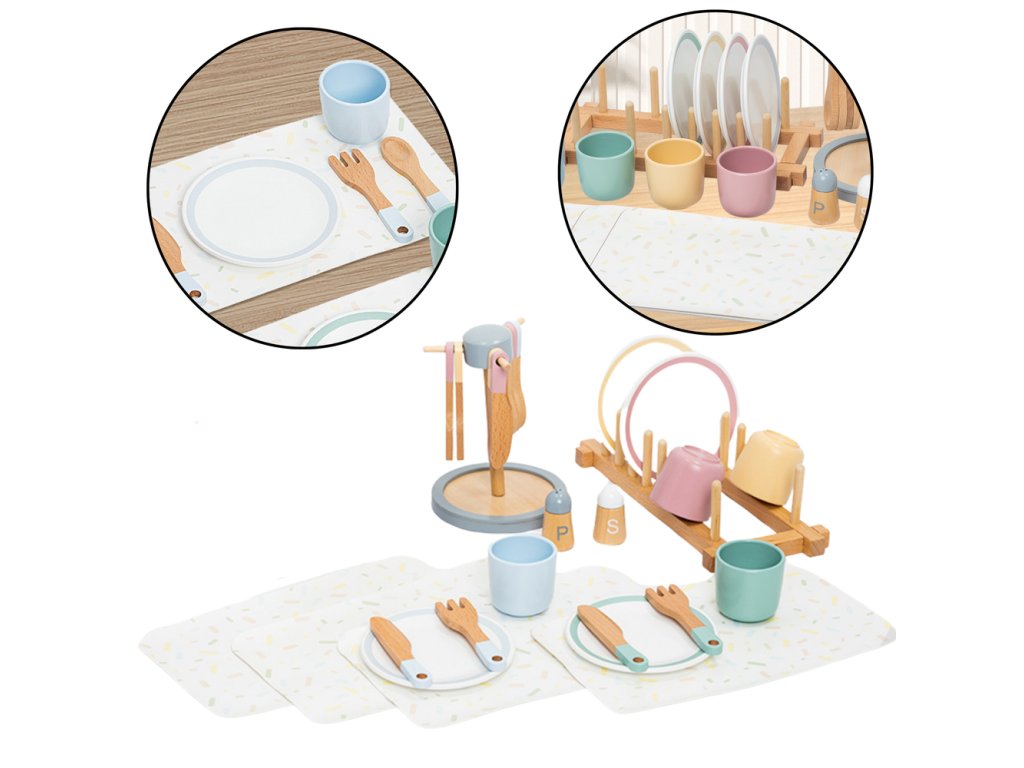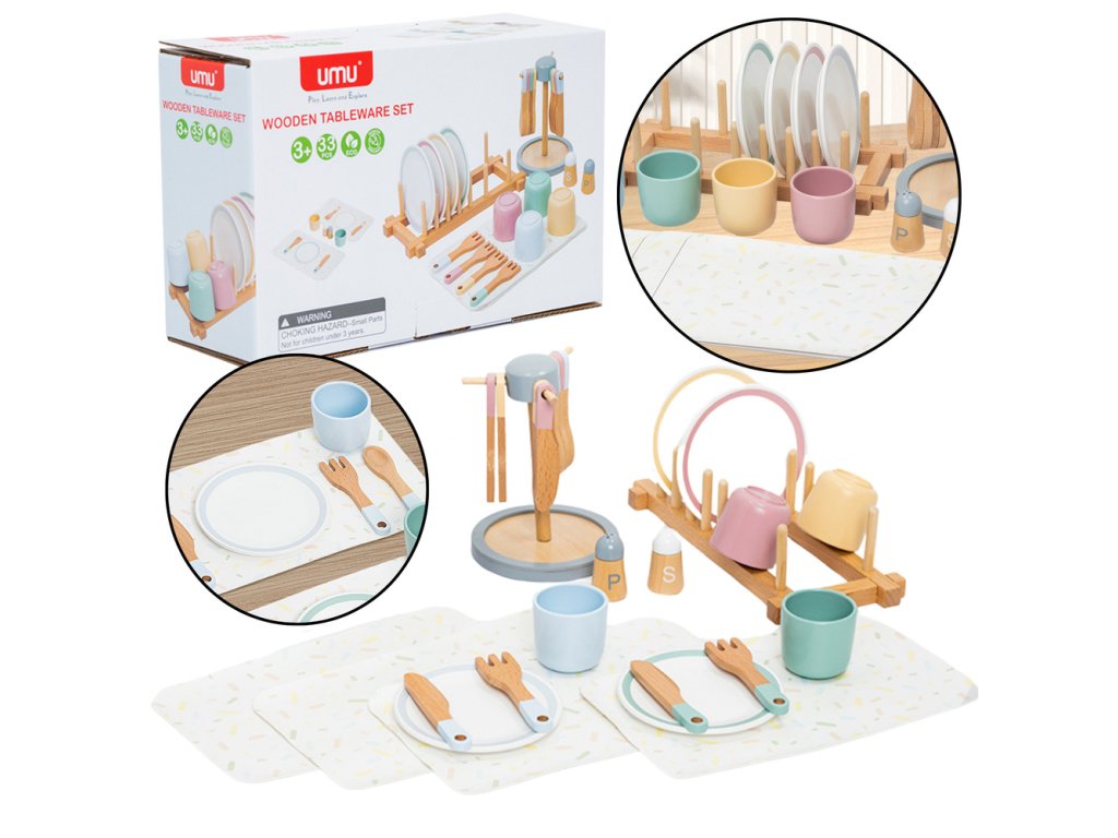 Dřevěný dětský jídelní set stojan na nádobí 33 dílů