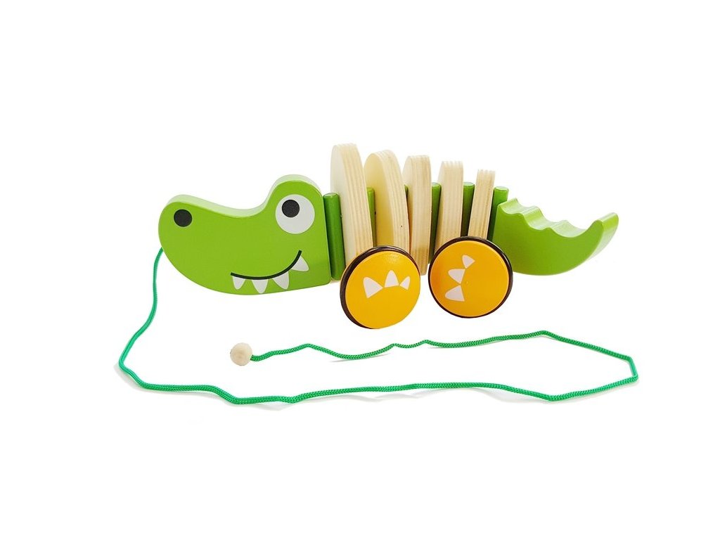 Roztomilý, usměvavý krokodýl bude následovat miminko, kamkoli půjde, jen bude držet provázek. Hračka na kolečkách na tahání je skvělá hračka pro děti od raného věku. Pomáhá při učení chůze a při prvních krůčcích. Hračka je vyrobena z vysoce kvalitního dřeva, díky čemuž je odolná a odolná proti poškození. Je natřený netoxickými barvami, které jsou bezpečné pro děti. Hračka rozvíjí schopnost pohybu, motoriku, kognitivní a zručnost. Krásný zelený aligátor natažený na provázku se charakteristicky ohýbá, což zpestří zábavu.