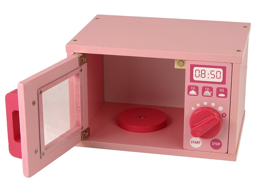 Dveře se zavírají na magnet a bez zatažení se neotevřou. Uprostřed je malý otočný knoflík, jeho uvedením do pohybu dokonale zopakuje ohřev ve skutečném sporáku. Mikrovlnka na boku má nakreslený displej s funkcí ohřevu, časem a dvěma LED diodami. Vyrábí se v krásné, tlumené růžové barvě.