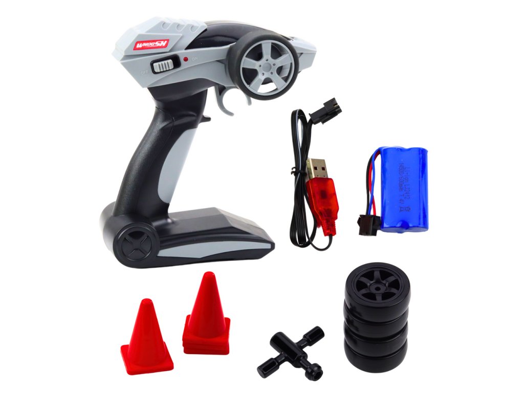 Vůz je vybaven LED světly (přední, zadní, neonové), které mu dodávají jedinečný vzhled zejména při večerních jízdách. Pokročilé dálkové ovládání 2,4 GHz nabízí přesné ovládání a dosah až 25 m. Funkce turbo vám umožní okamžitě zvýšit rychlost a další pneumatiky a kužely vám umožní vytvořit si vlastní trať a zlepšit techniku jízdy.