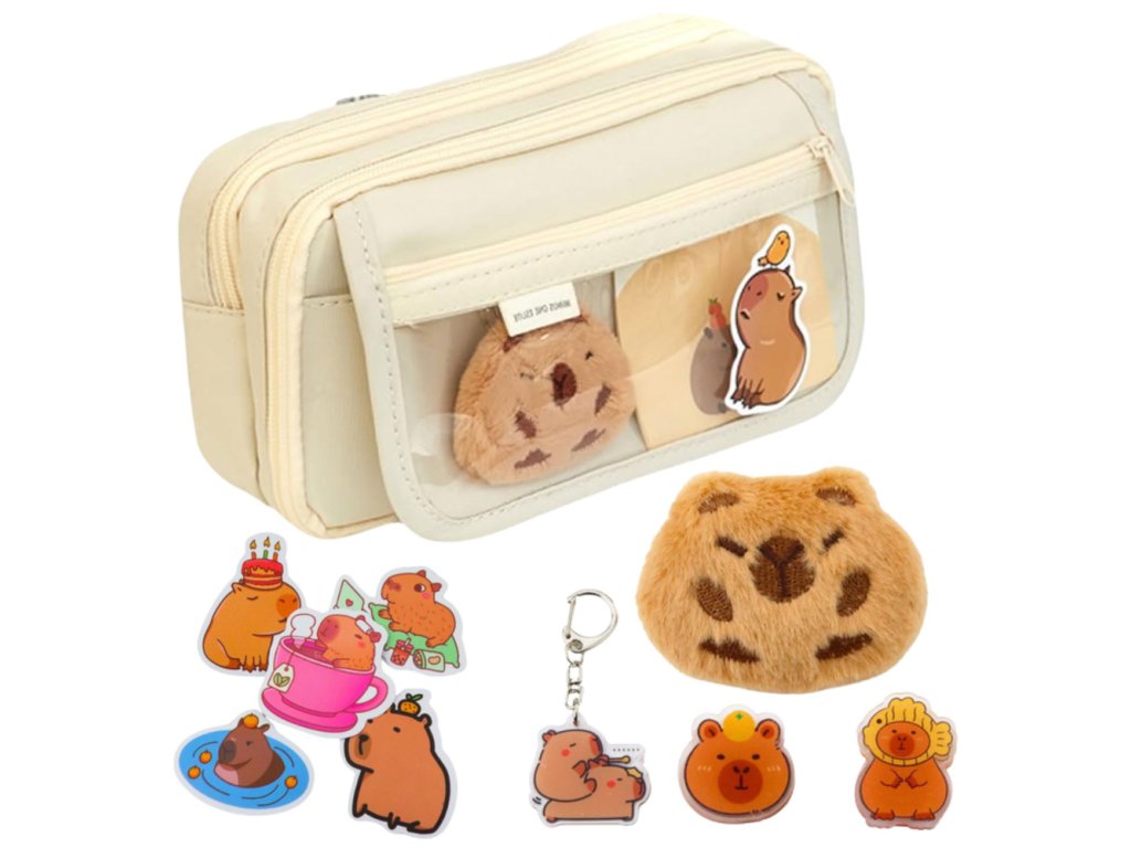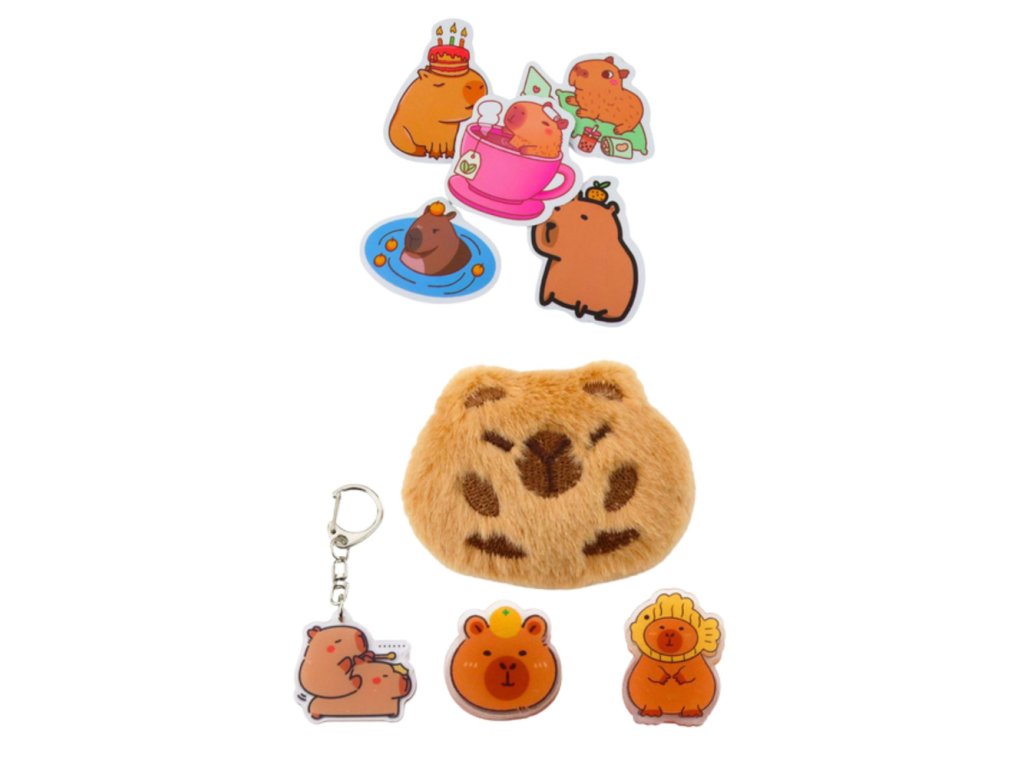 Sada obsahuje rozkošnou plyšovou kapybaru se zavíracím špendlíkem, kterou lze připevnit na penál, batoh nebo oblečení. Sada obsahuje také kapybaru klíčenku, dvě sponky, které lze připevnit na poznámky nebo kancelářské sponky, a pět zábavných kapybarských samolepek, které tvoří dokonalé dekorace. Nejde jen o penál, ale také o kreativní sadu doplňků, se kterou je každodenní používání potěšením.