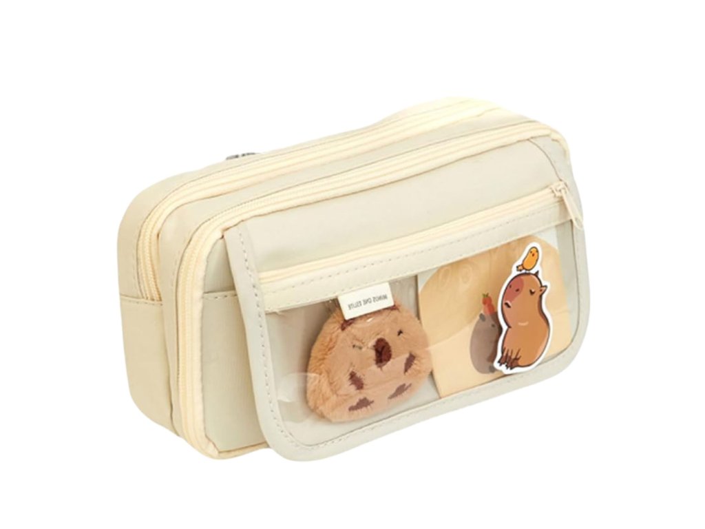 Tento béžový penál s doplňky kapybara je neuvěřitelně funkční a okouzlující set, ideální jak do školy, tak na každodenní použití doma nebo v kanceláři. Disponuje dvěma nezávislými přihrádkami, z nichž jedna je vybavena síťovými přepážkami, které umožňují pohodlné oddělení drobného příslušenství a lepší organizaci. Přední strana má dvě kapsy, z nichž jedna je průhledná, ideální pro uložení dekorací, samolepek nebo poznámek.