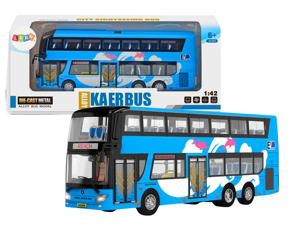 Dvoupatrový zájezdový autobus v měřítku 1:42, vyrobený v atraktivní modré barvě. Tento model je dokonalou reprodukcí skutečného autobusu, díky čemuž je ideální pro hraní i sbírání.
