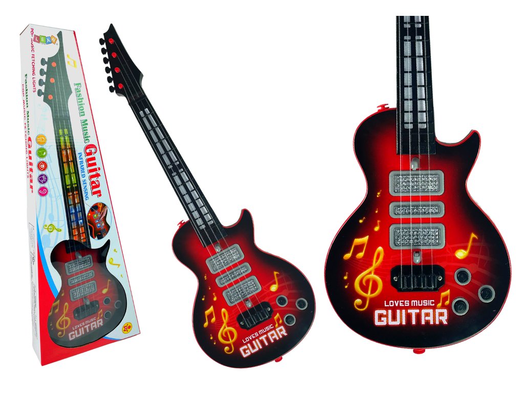 Kytara má 2 tlačítka, z nichž každé produkuje jiné zvuky, melodie nebo tóny. Schopnost hrát a měnit různé rytmy, písničky povzbudí vaše batole hrát. Možná vytvoří svou vlastní jedinečnou píseň. Další výhodou je připevněný, nastavitelný popruh, který dítěti usnadní držení kytary. Nástroj má 4 struny a pod ním jsou svítící LED diody v různých barvách, které doprovázejí hudbu na pozadí.