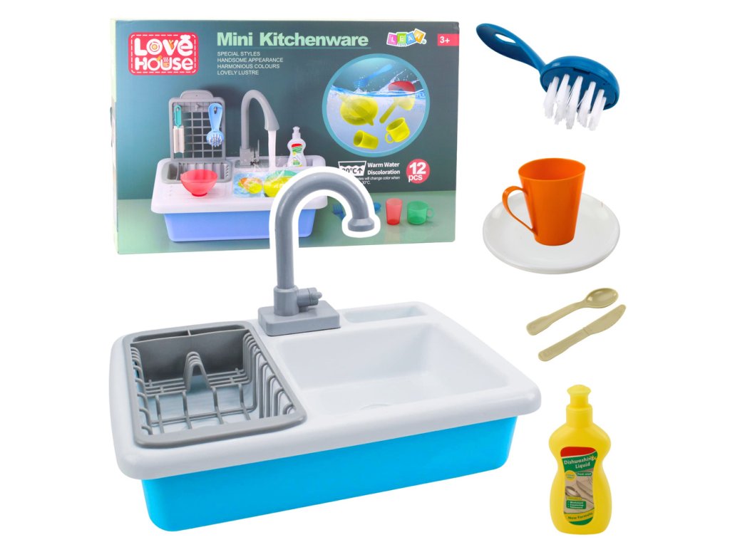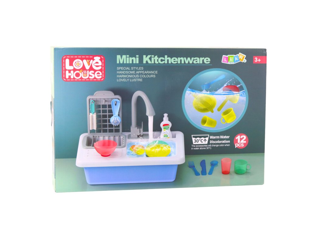 Sada mini kuchyňského nádobí je perfektní hračkou pro děti, které si rády hrají scény z každodenního života. Dřez obsahuje skutečný koloběh vody, který batolatům umožňuje nabírat a nalévat vodu pomocí funkčního kohoutku, takže hra je ještě realističtější a poutavější. Další atrakcí je příslušenství, které mění barvu, když je vystaveno horké vodě nad 30 °C (86 °F) – tento efekt děti potěší a umožní jim během hry pozorovat zajímavé proměny.
