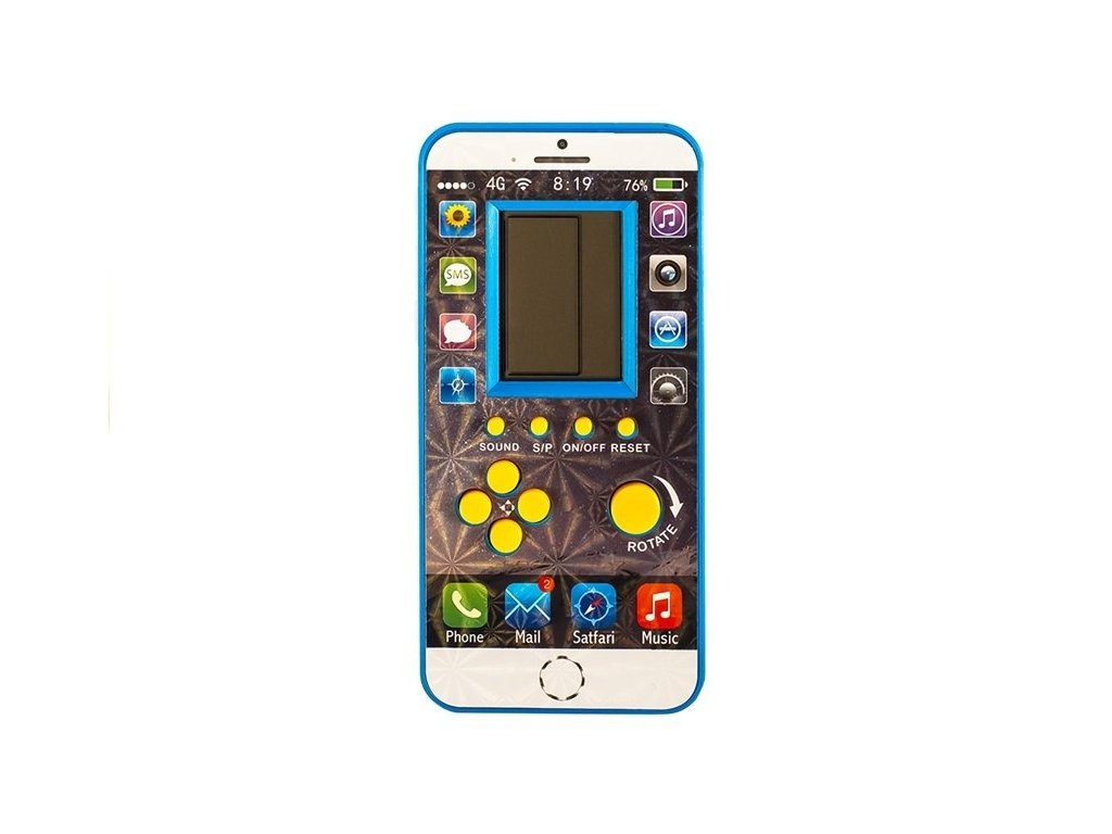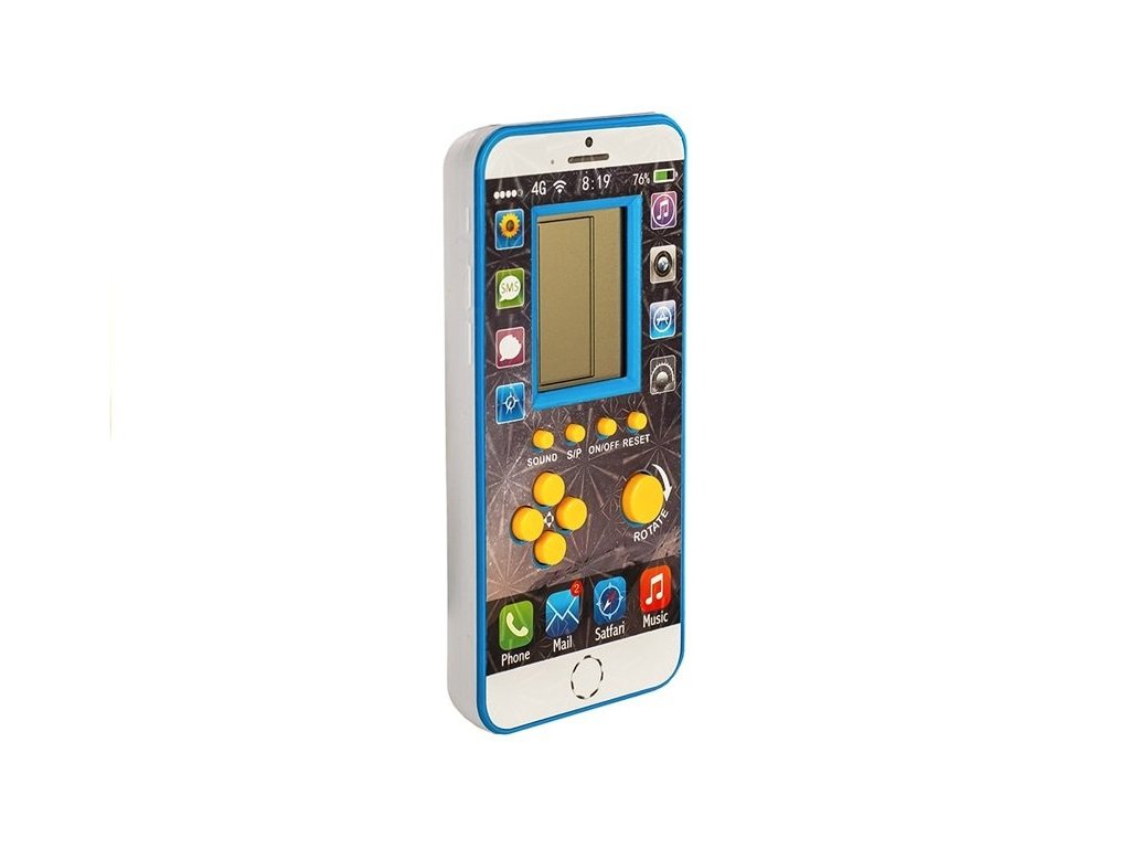 Prezentováno elektronická hra vypadá jako mobilní telefon. Bílé pouzdro s modrým akcentem dokonale ladí s lesklým potiskem na přední straně produktu. Kolem displeje jsou ikony připomínající ty, které dítě zná z telefonů rodičů – galerie, SMS, fotoaparát a hudební přehrávač. Díky tomu bude mít dítě pocit, jako by to mělo svůj vlastní mobilní telefon . Níže jsou žlutá tlačítka zodpovědná za herní funkce. Můžeme jimi zapnout a vypnout hru, resetovat hračku nebo zapnout melodii. Zbývající tlačítka slouží k navigaci během zvolené hry. Kapesní verze hračky Obsahuje mnoho různých her včetně Tetrisu, hadů a tanků, které vašemu dítěti zpříjemní chvíle v autobuse nebo o přestávce ve škole.