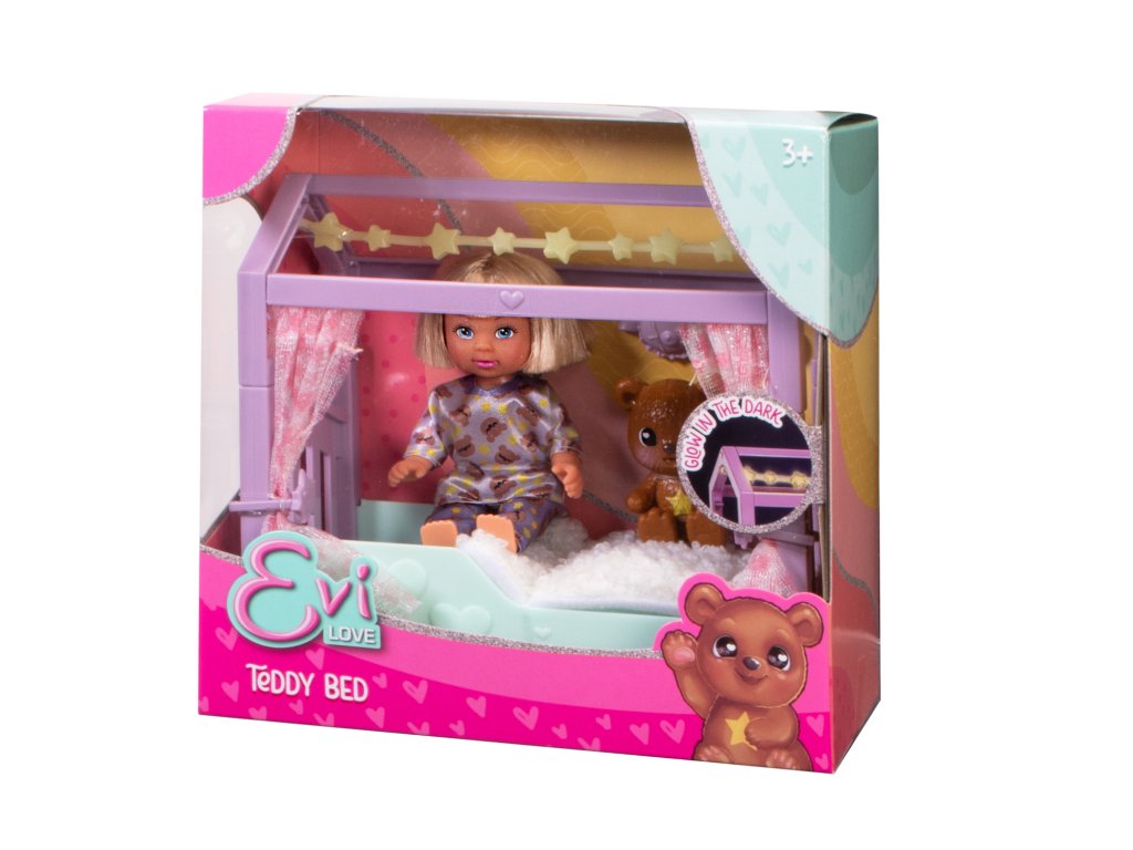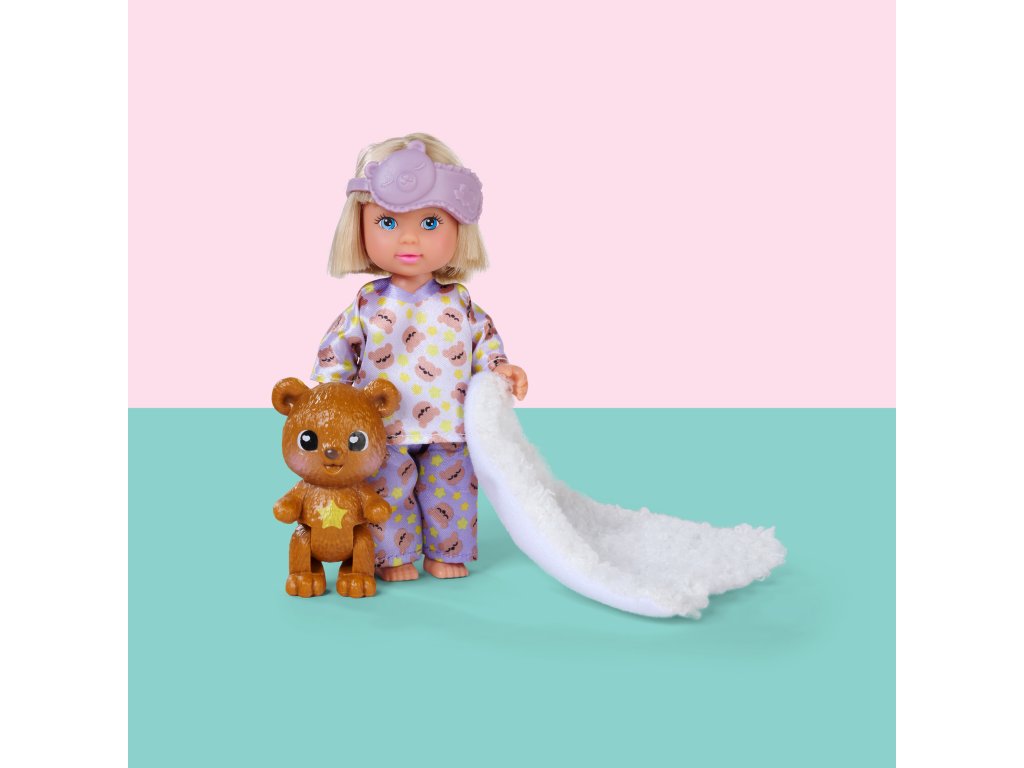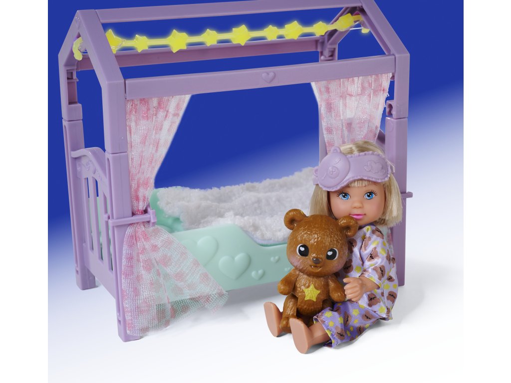Sada navíc obsahuje pásku přes oči , která panenku ozdobí, aby mohla klidně spát. Součástí balení je také Eviin oblíbený medvídek , který s ní sedí na měkké přikrývce zakrývající postel . Postel je vybavena fialovými rámy, které mají připevněný nebesa a dekoraci z hvězd zářících ve tmě ! Tato sada jistě osloví dívky, které si rády hrají s panenkami.